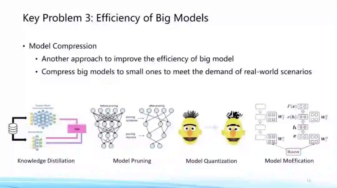 另一个方面,大模型一旦训练好去使用时,模型的“大”会让推理过程变得十分缓慢,因此另外一个前沿方向就是如何高效将模型进行尽可能的压缩,在加速推理的同时保持它的效果。这方面的主要技术路线包括剪枝、蒸馏、量化等等。同时最近我们发现,大模型里面具有非常强的稀疏发放的现象,这对于模型的高效压缩和计算有着非常大的帮助,这方面需要一些专门算法的支持。