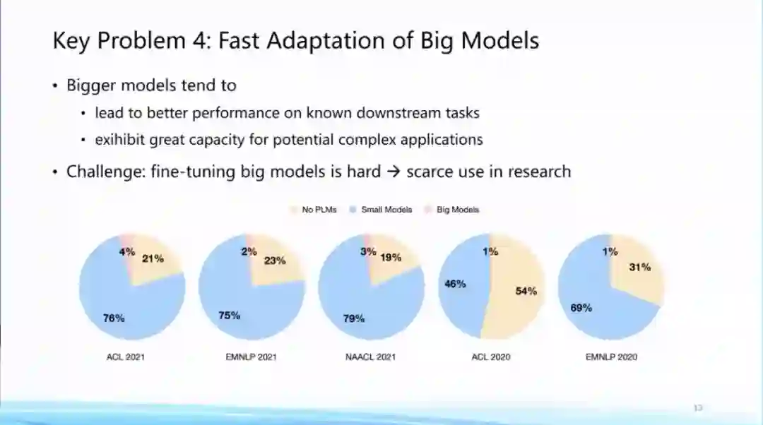 **第四个问题,大模型一旦训好之后如何适配到下游的任务?**模型越大,在已知任务上效果越好,同时也展现出支持未定义过的复杂任务的潜力。同时我们会发现随着大模型变得越来越大,适配到下游任务的计算和存储开销会显著增大。大家看我们统计结果从2020年到2021年顶会上的论文,你会发现越来越多的论文在使用预训练模型,但是真正去使用大模型的论文还是处在非常低的水平。