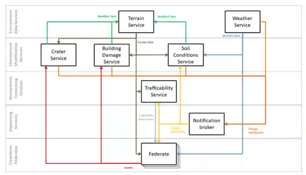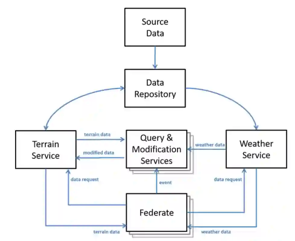 该解决方案架构的关键概念是共同服务负责在模拟练习中管理和分发环境数据。这意味着 M&S 联盟将使用 Terrain Service 来获取有关地形的信息,并使用 Weather Service 来获取有关天气的信息。通过让一项服务负责管理这些数据,可以缓解许多相关问题。此外,当对操作环境的合成表示进行动态更改时,特定的专业服务负责执行修改,从而消除在每个单独系统中本地实施此类修改时可能出现的相关问题。这些数据修改服务将其更改传达给地形服务,允许所有联邦成员从那里访问更新的数据。