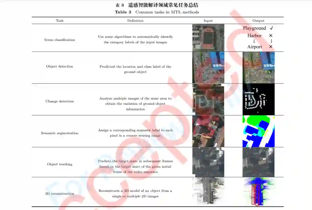 虽然深度学习技术极大地提升了遥感单任务解译的性能, 但面对复杂遥感场景, 单任务学习往往 难以取得令人满意的结果. 例如, 针对地物要素提取任务, 深度神经网络在降采样过程中, 往往会丢 失形状细节, 从而导致边界模糊; 大多数目标跟踪算法都由检测和重识别两个独立的阶段组成, 这导 致网络运行效率低下, 难以实现实时跟踪. 此外, 单任务模型在实际应用时还存在效率低下的问题, 针对覆盖范围上万平方公里的大范围场景, 上千种目标要素快速分类提取的应用需求, 需要多个单任 务模型针对同样的数据重复处理, 不仅需要庞大的计算、存储等资源, 还要求较长的推理运行时间. 多任务学习 (Multi-Task Learning, MTL) 旨在利用不同任务之间的相似性, 通过决策并行的模式同 时解决多个不同任务. 各个任务在学习过程中共享知识, 能从相关联的任务中获得额外的有用信息, 从而学到的模型效果更好、更鲁棒、泛化性能更好; 同时多任务学习在训练过程中使用共享表示, 多 个任务同时预测, 减少了数据来源的数量以及整体模型参数的规模, 使预测更加高效. 表3总结展示 了遥感智能解译领域的常见任务.
