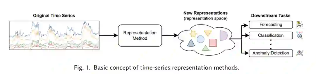 时间序列是按时间顺序记录的数据点序列,反映了特定变量或现象随时间的复杂动态。时间序列数据可以在不同时间点代表各种应用领域的有意义信息,使得做出明智的决策和预测成为可能,例如物联网中的传感器读数[1, 2]、网络物理系统中的测量[3, 4]、股票市场的波动[5, 6]以及可穿戴设备上的人类活动[7, 8]。然而,要从这些复杂的观测中提取和理解有意义的信息,我们需要一种表示这些时间序列的机制,这导致了时间序列表示研究的出现。基于新的表示,我们可以有效地进行各种下游时间序列分析[9],例如预测[10]、分类[11]、回归[12]和异常检测[13]。图1描绘了时间序列数据表示方法的基本概念。早期的尝试[14]使用分段线性方法(例如,分段聚合近似)、基于符号的方法(例如,符号聚合近似)、基于特征的方法(例如,形状片段)或基于变换的方法(例如,离散小波变换)来表示时间序列。这些传统的时间序列表示方法因依赖领域知识和预定义先验的通用性差而被认为是耗时且效率较低的。由于表示的质量显著影响下游任务的性能,许多研究提出自动学习有意义的时间序列表示[15-17]。这些研究的主要目标是获得高质量的时间序列学习表示,捕获数据中的有价值信息并揭示相应系统或现象的潜在动态。在几种方法中,神经网络或深度学习(DL)在从广泛数据中提取隐藏的模式和特征方面展现了前所未有的性能,包括时间序列,且不需要手动特征工程。