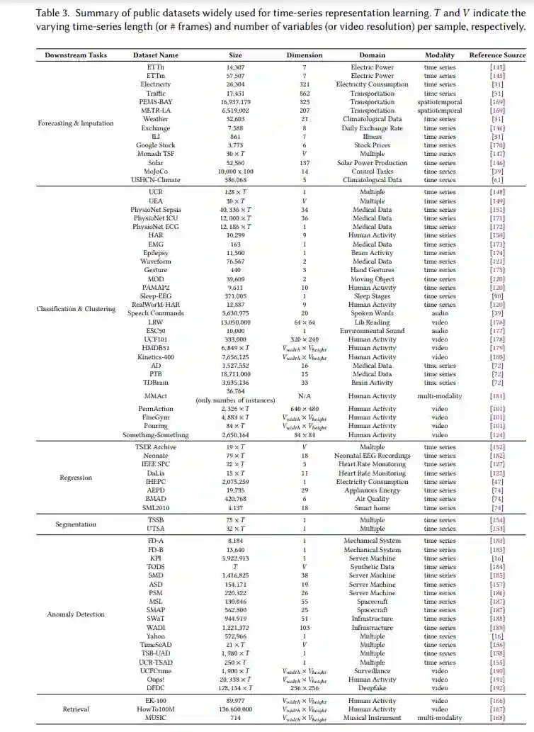 为了进一步提高表示质量并减轻在特定设置中训练样本有限的影响,例如在收集足够大数据量受限的情况下(例如,与人相关的服务),一些研究还采用了数据相关技术,例如增强[30]和转换[31],在现有学习方法之上。相应地,我们可以有效地增加训练数据的规模并提高其质量。这些技术在生成前置任务时也被认为是必不可少的。与其他数据类型不同,处理时间序列数据需要考虑其独特的属性,例如时间依赖性和多尺度关系[32]。本文旨在识别设计最先进的时间序列表示学习方法中的关键元素,以及这些元素如何影响学习到的表示的质量。据我们所知,这是第一篇关于通用时间序列表示学习的综述。我们提出了一种新颖的分类法,用于从新颖性角度学习时间序列的通用表示——即论文的主要贡献集中在上述哪些设计元素上——以总结选定的研究。表2总结并比较了基于所提分类法的审阅文章。从神经架构的角度来看,我们总结了用于表示学习的神经架构在模块层面和网络层面上的变化。从学习角度来看,我们分类了用于使学习到的表示能够泛化到各种下游任务的目标。最后,我们还对特别关注提高训练数据质量的论文进行了数据中心的方法分类。