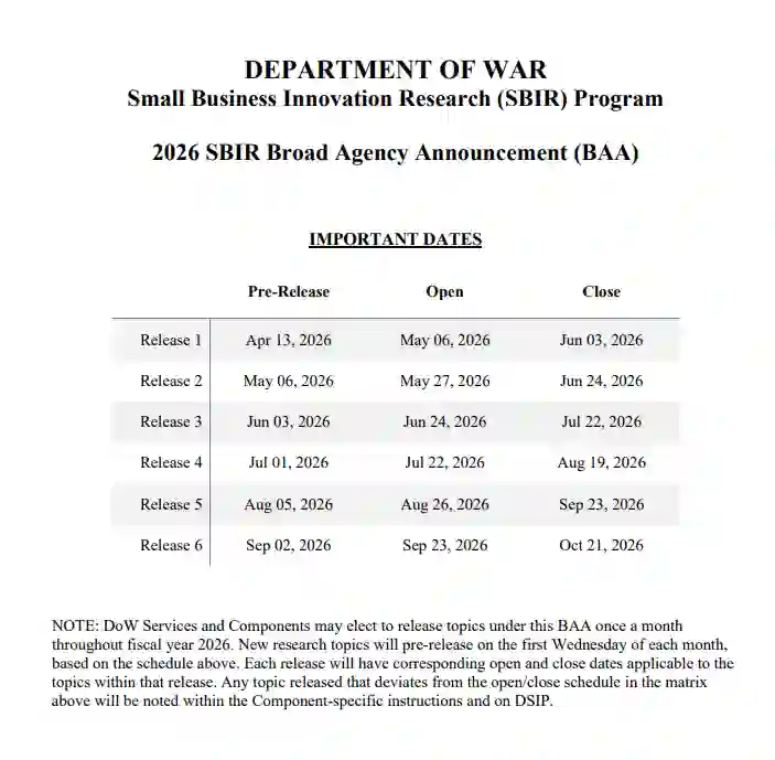 美战争部(DoW)小企业创新研究(SBIR)计划的目标包括:通过强化小型企业在满足战争部研究与开发(R&D)需求中的作用来刺激技术创新,向作战人员交付创新技术,并通过商业化壮大国防工业基础。 小企业管理局(SBA)通过其SBIR/STTR政策指令,有意脱离传统的政府征询格式和要求,简化SBIR/STTR奖项的授予流程,并最大程度减轻小型企业的监管负担。根据小企业管理局SBIR/STTR政策指令,战争部正以广泛机构公告(BAA)的形式征集提案。战争部邀请有能力在任何本SBIR计划BAA中描述的国防相关主题领域内开展研发并将其成果商业化的小型企业提交提案。 三阶段计划