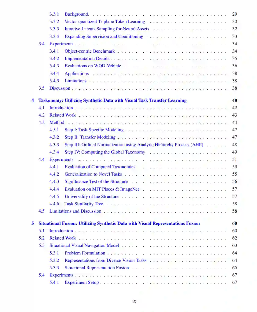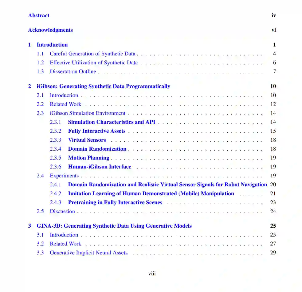 第一项工作着眼于合成数据的生成。我介绍了两种旨在生成与真实世界分布一致的合成数据的方法。首先,我提出了iGibson,一个模拟环境,用于在大规模真实场景中开发机器人的交互式解决方案。iGibson构建了3D扫描真实世界家庭的交互式复制场景,使对象、布局和可交互性的分布与真实世界一致。为了进一步促进更健壮的具身代理的训练,iGibson提供了针对材料(视觉外观和动态特性)和对象形状的领域随机化程序,同时尊重对象放置的分布并保持可交互性。其次,我提出了GINA-3D,一个使用来自摄像机和LiDAR传感器的真实世界驾驶数据的生成模型,创建多样化车辆和行人的逼真的3D隐式神经资产。与iGibson不同,后者涉及在建立模拟环境时显著的人力努力,GINA-3D利用了直接学习生成与真实世界观察匹配的合成资产的生成模型。我展示了证据,表明GINA-3D在生成的视觉和几何质量方面实现了最先进的性能和多样性。