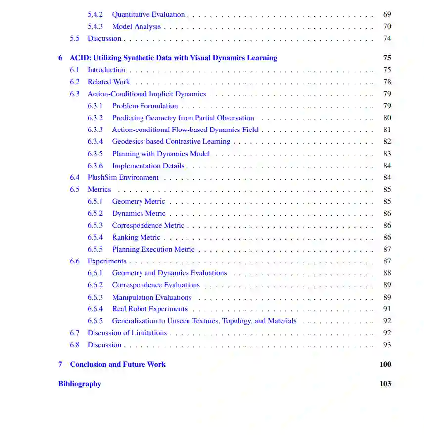 第二项工作专注于有效地利用合成数据。通过设计健壮的学习算法和模型,我们可以创建更好地泛化到真实世界场景的模型。首先,我介绍了Taskonomy,它利用合成数据构建了任务空间的计算分类法和地图。通过利用任务关系,我展示了证据,表明我们可以使用比完全监督方法少至少一个数量级的数据,且模型可以很好地泛化到真实世界数据集。然后,我介绍了情境融合,它训练代理融合一大组对应于多样化视觉感知能力的视觉表征。这种方法在新环境中的性能显著提高,超过了真实世界预训练的基线和其他融合方法。最后,我介绍了ACID,用于变形物体操纵的动作条件隐式视觉动态。通过利用大规模合成数据和独特的几何和动力学监督,我可以将模拟训练的ACID模型直接应用于真实世界物体,并在将它们操纵成目标配置方面取得成功。
