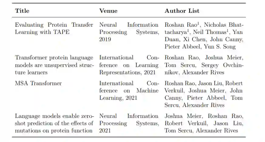 本文介绍了在一个通用基准上训练和评估蛋白质语言模型的方法。随后,研究了增加模型扩展、数据集预处理和超参数训练对transformers 在没有监督的情况下学习蛋白质接触能力的影响。一种新的方法操作在MSAs而不是单一序列,然后提出,并显示在几个下游任务达到最先进的性能。最后,讨论了这些方法在蛋白质设计中的应用。