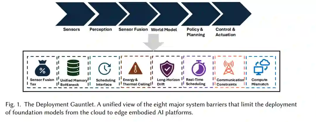 当前在受限硬件上部署基础模型的方法大多强调局部优化,如量化和剪枝 [59, 88]。这些方法虽然降低了推理成本且极具价值,但并不能解决具身部署中的主导性失效问题——即在闭环执行下感知、计算、内存、时序与控制之间的交互问题。在具身系统中,某一层级的压力会迅速传导至整个技术栈,从而降低整体可靠性。为了系统化梳理这一问题,我们引入了**“部署挑战”(Deployment Gauntlet)**,这是一套系统分类法,定义了具身基础模型在实时边缘环境中实现稳健运行必须满足的条件。 图 1 总结了构成“部署挑战”的八大障碍。它们涵盖了具身智能流水线中反复出现的瓶颈,包括多模态感知与数据迁移、异构计算与共享内存、时间敏感型控制、长时运行、安全执行以及边缘-云协同。尽管在分析时它们各具特性,但在实践中却是高度耦合的:某一维度的压力往往会放大其他维度的失效。因此,该分类法为评估制约实时具身 AI 的部署约束提供了一个具象的框架。 我们将“部署挑战”划分为贯穿“从感知到控制”连续体的八个耦合障碍: 1. 传感器融合税(Sensor Fusion Tax):由异步传感器流的时间对齐引入的延迟与抖动,包括中间件(如 ROS 2)引发的序列化和缓冲开销。 1. 异构计算失配:当稀疏或不规则的工作负载映射到专为密集、静态矩阵运算优化的加速器上时产生的低效性。 1. 统一内存瓶颈:高带宽模型权重流传输与共享内存通道上的持续传感器数据接入之间的资源竞争。 1. 能耗与散热天花板:持续运行期间由热节流和电池耗尽导致的性能退化。 1. 长时漂移(Long-Horizon Drift):在长时间部署过程中,状态估计、校准和时钟同步的渐进性失效。 1. 安全与验证鸿沟:由控制回路中的幻觉状态或分布外(OOD)行为引发的安全关键型故障。 1. 实时调度干扰:由操作系统抖动、非确定性内核执行以及共享加速器竞争导致的控制不稳定性。 1. 通信约束:限制边缘到云端卸载(Offloading)及多智能体协作的带宽与延迟限制。