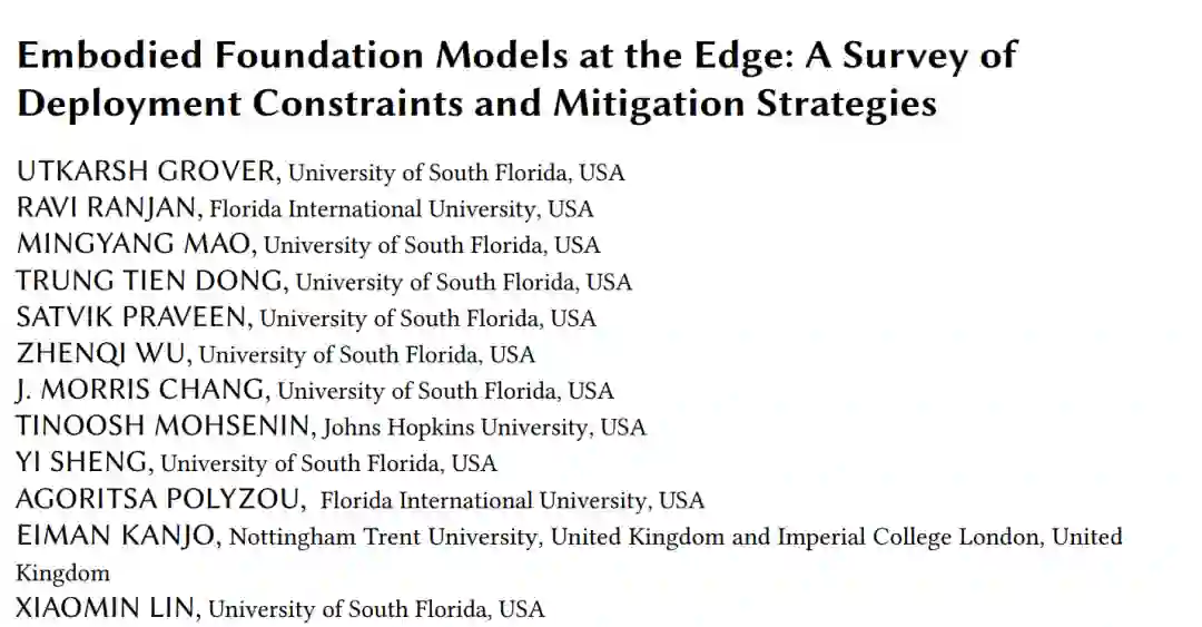 在具身边缘系统中部署基础模型从根本上是一个系统问题,而不仅仅是模型压缩问题。实时控制必须在严格的尺寸、重量和功耗(SWaP)约束下运行,其中访存流量、计算延迟、时间波动性和安全余量直接相互作用。“部署挑战”将这些约束组织成八个耦合的障碍,决定了具身基础模型能否在实践中可靠运行。在代表性的边缘工作负载中,自回归视觉-语言-动作(VLA)策略主要受内存带宽限制,而基于扩散的控制器更多地受计算延迟和持续执行成本的限制。因此,可靠的部署取决于内存、调度、通信和模型架构之间的系统级协同设计,包括将快速控制与较慢的语义推理分离的分解方法。