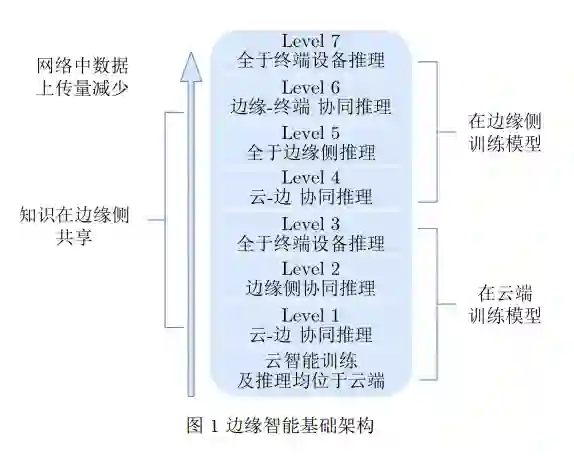 边缘智能是利用边缘计算技术运行人工智能应 用程序的一种范式,其能充分利用边缘资源。边缘 计算是边缘智能的基础,从原理上讲,边缘计算是 将计算单元部署在终端设备以及云计算中心的新型 计算范式[13]。随着人工智能应用的大数据属性不断 提升,大数据使能的人工智能应用正逐渐成为主导[14]。 近年来,轨道交通大数据化已成为趋势[15]。然而, 现有的计算架构在面临海量数据处理时面临着不可 避免的缺陷。终端设备由于其自身算力薄弱,无法 支撑海量数据的计算任务。与此同时,云计算架构 又面临着巨大的主干网络压力以及较大的传输时 延。因此,通过将人工智能应用推向网络边缘,边 缘智能的理念应运而生。 边缘智能中的资源涵盖了从云计算中心到终端 设备上所有的计算、网络资源。边缘智能,即将人 工智能技术应用于边缘计算框架中。边缘智能涵盖 了协同训练及协同推断,如图1所示,其基础架构 可分为7层(Level):模型放置与云计算中心训练, 并由云-边协同推理模型(Level 1)、模型放置与云 计算中心训练,边缘侧协同推理模型(Level 2)、模 型放置与云计算中心训练,模型均于终端设备推理 (Level 3);基于边缘侧训练模型的云-边协同推理 (Level 4)、全于边缘侧推理(Level 5)、边缘-终端 协同推理(Level 6)、全于终端设备推理(Level 7)。 在边缘智能框架中,数据更多地留在边缘服务 器或终端设备中处理,原始数据将避免在主干网络 中直接传输。其中,随着边缘智能等级(Level)的提 升,网络中数据的上传量越少,因此由于数据传输 过程中的网络攻击带来的信息泄露、信息被篡改的 风险也将显著降低。特别地,在全于终端设备推理 (Level 7)模式下,所有的数据将在终端设备本地生 成、处理、推理计算,具备离线运行属性,满足部 分高隐私敏感性应用的运行需求。因此,对于隐私 高敏感性的数据源来说,其数据由于在主干网络的 传输过程中由于数据泄露、黑客攻击导致的隐私安 全问题将得以缓解。与此同时,相较于传统的基于 云计算中心的计算架构模式,在边缘智能架构中由 于边缘服务器与终端设备间物理距离相较云计算服 务器与终端设备间显著缩短,其数据传输时延将显 著降低,具备更强的数据处理低延迟特性。将计算 过程从云计算服务器移动至边缘服务器,极大减少 了不可避免的数据网络传输时延,可以让实时性要 求较高的应用成为可能。同时,对比传统的边缘计 算模式,边缘智能将人工智能技术引入其架构之 中,依托人工智能技术将更好地完成任务卸载、资 源费配的决策,从系统架构上赋予了智能化服务的 能力。智能化的服务卸载策略将根据实际情况动态 做最优化判断,保证用户始终拥有最好的服务水 平。由于边缘服务器可以对数据进行预处理,终端 设备产生的原始数据不再需要全部上传至云计算中 心,边缘服务器可以选择性地上传数据处理后的信 息至云计算中心。因此,主干网络的压力将得到极 大的缓解。边缘智能同时还具有更高的隐私安全 性。综上,在边缘智能框架中,既可以将人工智能 软件部署在边缘计算框架中以实现低延迟、高隐私 安全的智能化应用,又可以应用人工智能算法实现 边缘服务器智能切换以提升服务质量。