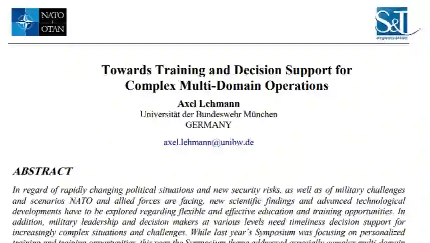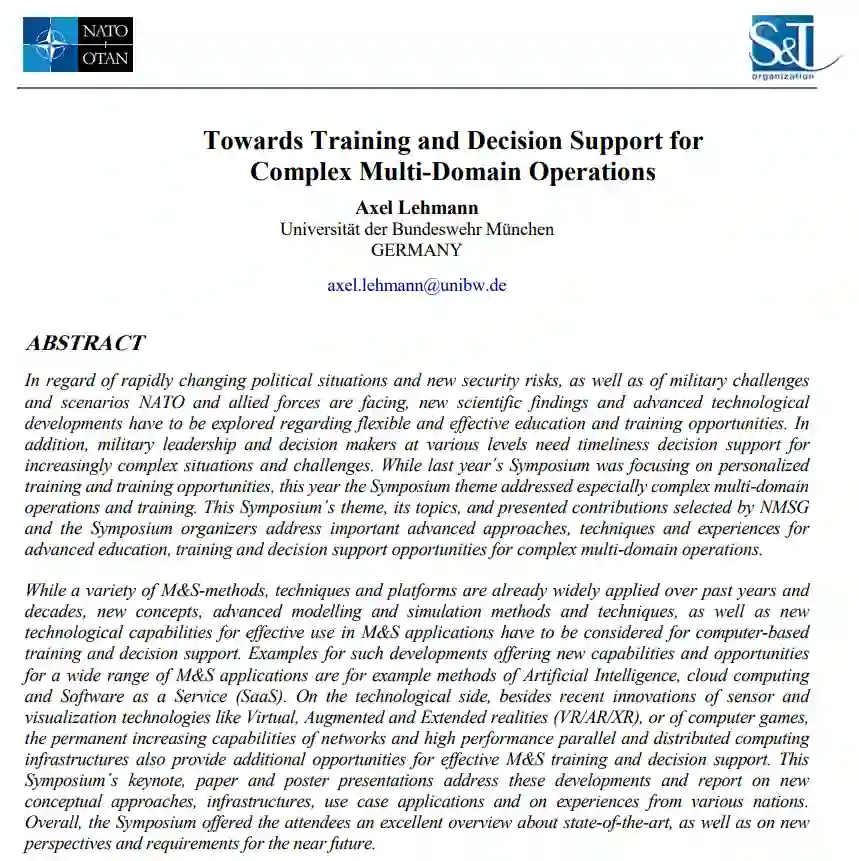 鉴于瞬息万变的政治局势和新的安全风险,以及北约和盟军面临的军事挑战和情景,必须探索新的科学发现和先进的技术发展,提供灵活有效的教育和培训机会。此外,各级军事领导和决策者需要提供及时的决策支持,以应对日益复杂的局势和挑战。去年的研讨会侧重于个性化培训和培训机会,而今年的研讨会主题特别关注复杂的多领域操作和培训。本次研讨会的主题、主题和提交的文稿由NMSG和研讨会组织者选择,旨在为复杂的多域作战提供先进的教育、培训和决策支持机会的重要先进方法、技术和经验。