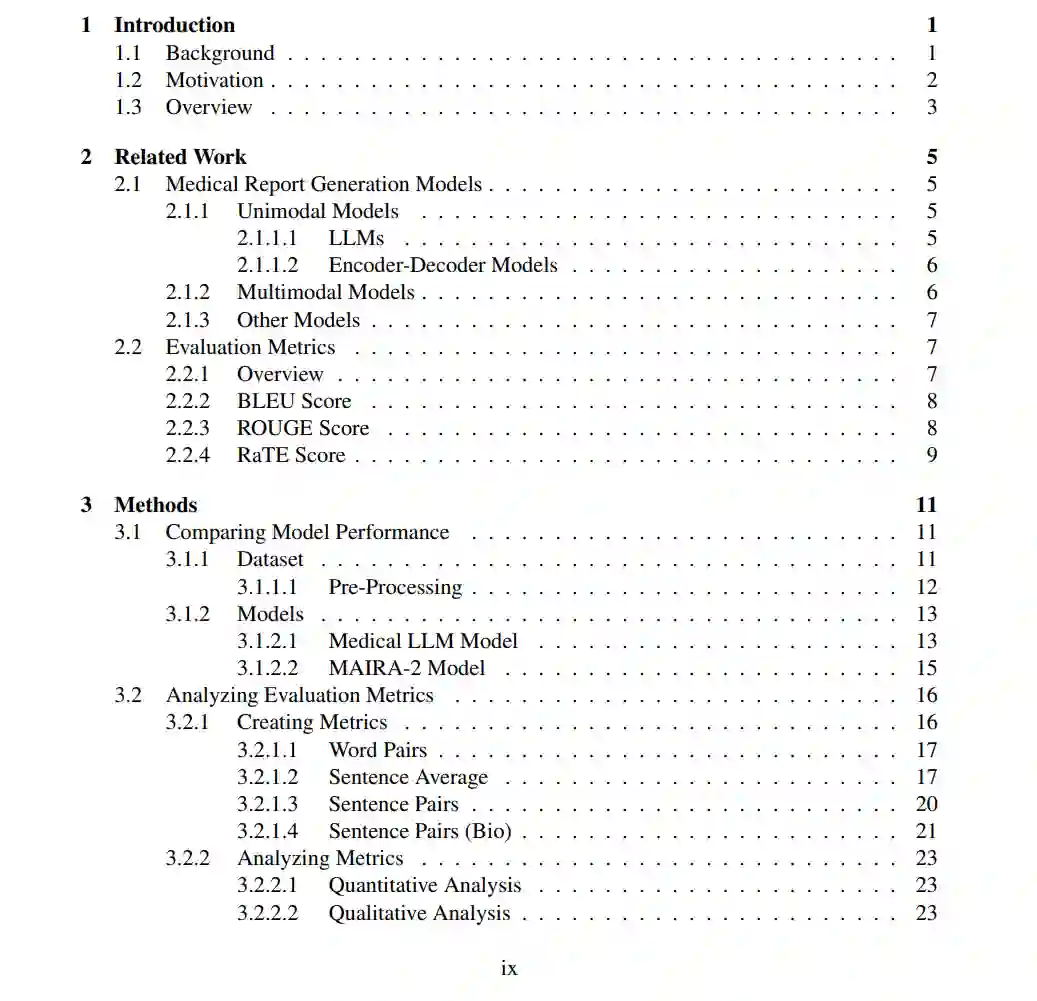 随着基础模型(包括大规模视觉语言模型)的最新进展,许多研究者探讨了将多模态数据作为视觉问答输入的结合方法。在医疗领域,视觉问答的一个关键应用是自动化医学报告生成,其中可能提供胸部X光图像和患者基于文本的症状数据,目的是生成相关的医学报告。然而,很少有研究分析这些模型与单模态微调的大型语言模型(LLM)的性能差异,更少有研究比较这些多模态模型在提供症状信息作为输入时的表现。此外,过去的研究通常使用简单的评估指标,如n-gram重叠(例如BLEU和ROUGE分数),这些指标对于能够生成不同句子但具有相同语义意义的生成式基础模型并不有效。 本文的主要贡献有两个。首先,我们比较了多种医学报告生成方法在胸部X光医学报告数据集上的表现,包括单模态微调的医学LLM、没有症状数据的多模态模型和包含症状数据的多模态模型。其次,我们引入了四种新的评估指标,用于评估生成医学报告与参考医学报告之间的相似性,分别为:单词对、句子平均、句子对和句子对(生物)。我们的结果表明,针对医学报告生成的多模态方法远优于单模态方法,且提供症状数据略微提高了生成报告的准确性。我们还发现,我们新提出的句子对评估指标比所有之前的指标更能准确衡量生成报告与参考报告之间的相似性,这一点通过全面的定量和定性案例研究对比得到了证实。 这项研究从根本上推动了医学报告生成的前沿,进一步增强了使用多模态模型和症状输入的准确性优势,并引入了几种更为全面、定制化的评估生成医学报告的评分指标。