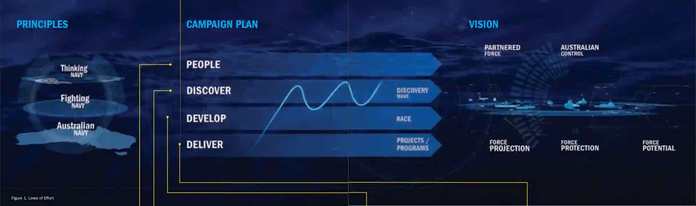 RAS-AI 2040战略提出了四个LOE(人、发掘、开发和交付),作为海军实现RAS-AI愿景的手段。海军的RAS-AI战略计划确定了一个将发掘活动与交付联系起来的过程。该计划中涉及的这些LOE的关键方面是:
