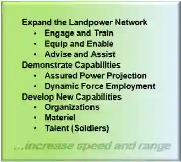 战略陆地力量的威胁,即陆军随时准备发动作战行动的形式,对于那些喜欢在竞争或危机中取胜而避免长期冲突的对手来说,仍将是一种重要的威慑力。陆军必须继续展示能力范围,通过有保障的力量投射和动态的部队使用,以新的方法来设定战场和全球。