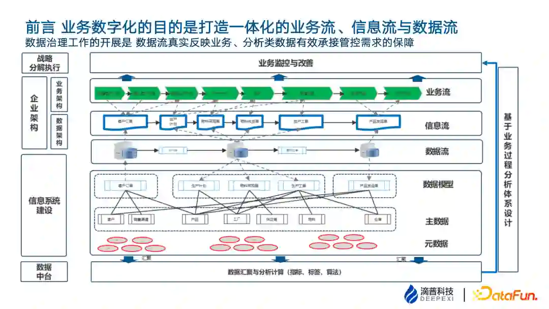 从企业整体经营管理的角度,战略制定及分解—领域业务目标制定—业务方案设计—业务需求识别 & 信息系统功能及数据库设计—数据汇聚及分析—业务目标监测及改善,这个过程会有层层信息耗散,全局数据治理的目的就是利用体系机制保障最大程度减少这个耗散或补足耗散的部分,让数据尽可能的还原企业的业务事实。 企业在 IT 规划过程中,首先会做业务流梳理,表现为流程架构、价值流或者能力框架;业务流中的相关信息流转,如表、证、单、书等,称之为信息流;信息流中识别出数据对象,梳理数据关系,可以指导数字化系统建设。 但是企业在实际开展数字化过程中,人力资源、采购、生产、研发等每个领域都会有数字化诉求。业务人员和 IT 人员通过分析应用诉求,把业务流转和应用需求相结合,进行数据设计,进而形成新系统。因为 IT 建设是逐步开展的,业务人员的视角不同,实施人员和数据开发人员的理解各异,最终每个系统都会对数据有自己的局部理解,因此简单的把人力资源、采购、生产、研发等存量信息系统里面的数据拼到一起,是无法构建出反映企业业务本质的数据流或者数据孪生模型的。 数字化的数据如果无法反映业务全貌,那基于这些数据进行加工也不可能得到正确的结果,因此需要通过对业务的理解进行数据治理。 数据治理是从业务流到信息流、数据流、数据库表的流转。业务系统中的物理表字段,哪怕短期内由于无法改变业务系统不能完成源头治理,也要在数仓的 ODS 层完成治理,形成能还原业务本质的数据映象。 数据映象描述的是业务过程中的业务细节。企业经营中战略分解到各业务部门的经营目标都会有相关的考核指标。如果数据映象是真实的,那基于指标体系做的业务分析就能更真实反应业务阶段结果,达成企业业务流、信息流、数据流的一致性,支撑企业从战略规划到目标分解的监控,最终实现数据价值的呈现。 总结来说,整个数据治理的核心动作分为两个部分,一个是业务数据的治理(形成真实数据映像),另一个是分析体系的治理(基于数据映像面向管控目标做合理性的分析结构设计及实现)。