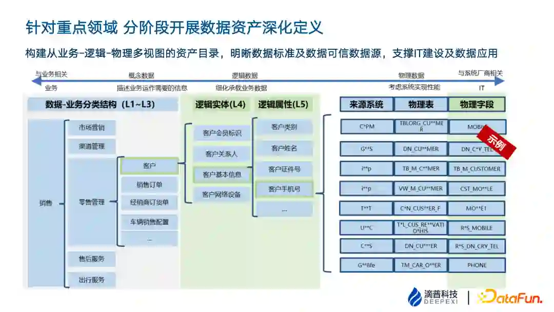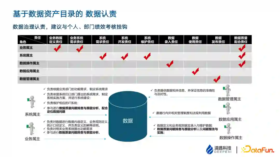 数据资产目录到 L3 层是业务分类结构,如上图从销售、零售管理到客户,是业务人员一看就明晰的结构。 但 L3 层是一个偏概念性的东西,需要填充更多的属性形成逻辑实体。也就是将概念实体切割成逻辑实体和逻辑属性。 再往下就是物理表的映射。逻辑实体和存量的物理表的区别在于,逻辑实体在业务侧承载更多的业务细节,但是系统表的数据结构设计还有性能上的考虑,数据库的性能、读写的性能、以及冗余字段。 7. 基于数据资产目录的数据认责