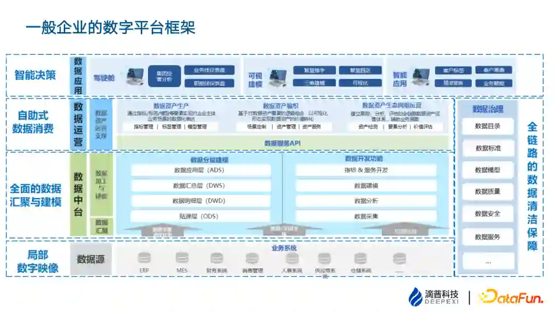 典型企业的数字平台框架如上图所示。 (1)业务系统作为局部数据映象或数据源。 (2)数据中台做全面的数据汇聚与建模,数据中台基于贴源层、明细层、汇总层、应用层进行分层,面向分析型需求由开发人员进行数据建模。 (3)自助式数据消费是面向业务分析师或者有一定业务理解能力的开发人员,他们会自助式的基于成熟的模型进行组装式的开发。 (4)智能决策包括驾驶舱、可视建模和智能应用等。 从业务数据系统的数据源到分层的数据建模以及数据消费的全过程,需要一系列的管理机制,包括数据标准、数据模型、数据质量以及管理流程和机制,形成了一套体系化、规范化的方法,保证整个链路的畅通。 3. 对数据治理核心内容的理解