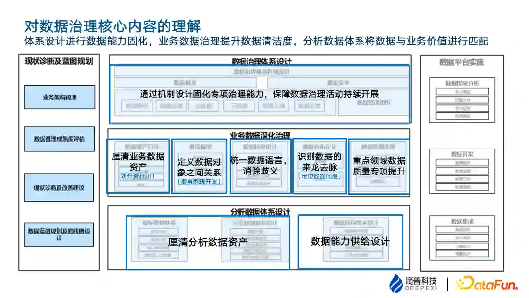 滴普对理解的数据治理核心内容包括三块:数据治理体系设计,业务数据深化治理,分析数据体系设计。