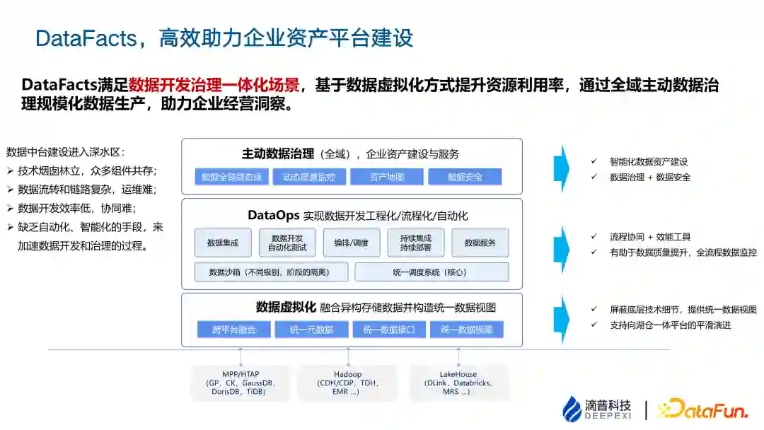 以上是数据治理的开展路径以及核心的数据资产工作部分。数据资产目录设计、数据模型、数据标准,这些数据管理动作需要有一个 IT 平台去落地,滴普提供一站式的数据智能服务的平台,包括从数据集成到数据治理(数据标准、数据质量、数据安全等),数据资源的开放和共享。