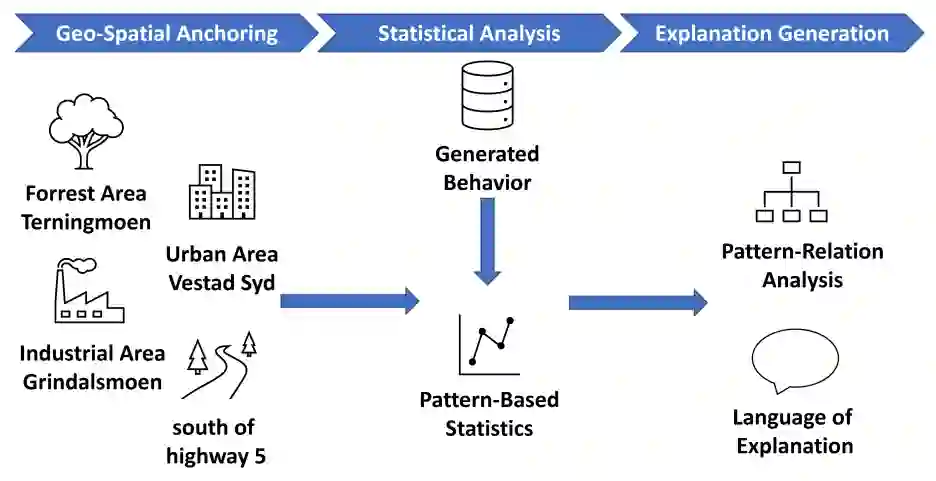 在这项工作中,我们以与模型无关的方式处理问题,即生成 COA 的算法的内部推理机制不能用于推导解释。这样做有几个原因 (1) 将算法视为黑箱,解释生成方法就可以应用于任何类型的算法。(2) 目前还没有就哪种方法最适合生成 COA 达成共识,因为 COA 的性质相当复杂。当不同的技术被证明更有效时,在基于模型的解释上所做的努力可能很快就会被淘汰。我们提出了一种使用三步法生成人类可读解释的方法,如图 3 所示。这三个步骤是:(1) 地理空间锚定,提取描述任务区的术语;(2) 统计分析,使用学习系统生成的数据评估潜在的解释模式;(3) 生成解释,将有希望的模式转化为人类可读的文本。
