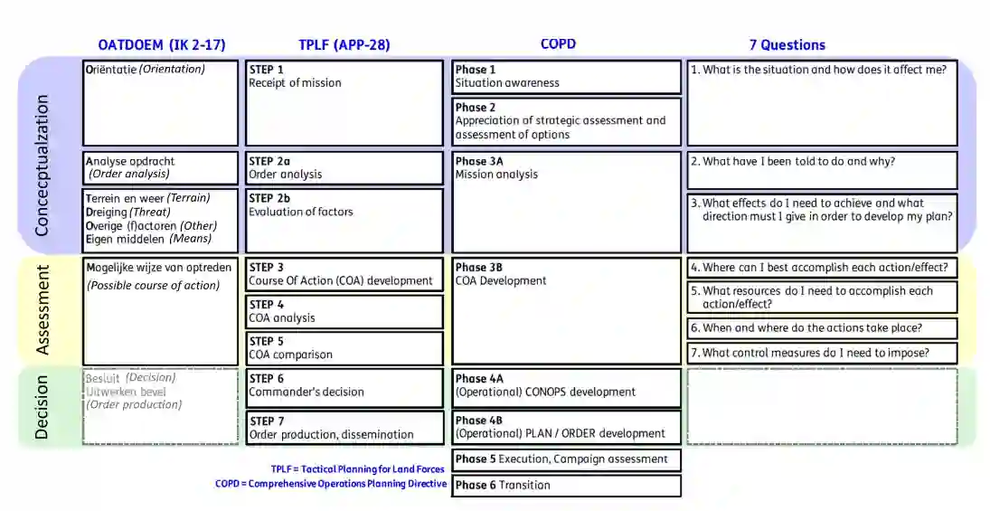 制定行动方案(COA)是陆地作战军事决策过程中的关键步骤。制定行动方案过程的步骤包括生成可能的行动方案、根据指挥官给出的标准对行动方案进行评估,以及从所有生成的行动方案中选择一个作为命令的行动方案。这是一个人工的、创造性的过程,指挥官及其参谋要考虑许多因素。人工遵循这种流程的好处是,计划人员还能将预见的任务内化,从而更有能力适应新情况。不过,这种手工流程也有缺点,如无法考虑所有可能性、涉及的人员数量多、所需时间长以及难以评估主要行动方案。新技术,如基于人工智能的规划技术和作战模拟,可以克服这一缺点,并提供决策支持工具,通过考虑各种可能性并建议系统认为具有高潜力的可能性,来促进这一人工流程。