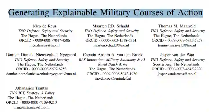 行动方案是在战场上取得决定性优势的复杂计划。任何提出行动方案的人工智能系统都会对大量可能的行动方案进行分析,并以某种方式对这些方案进行比较。人类也遵循类似的过程,最大的区别是只考虑 2-3 种主要作战行动。不过,人类可以解释自己的选择和偏好,决策支持系统也应具备类似的功能。