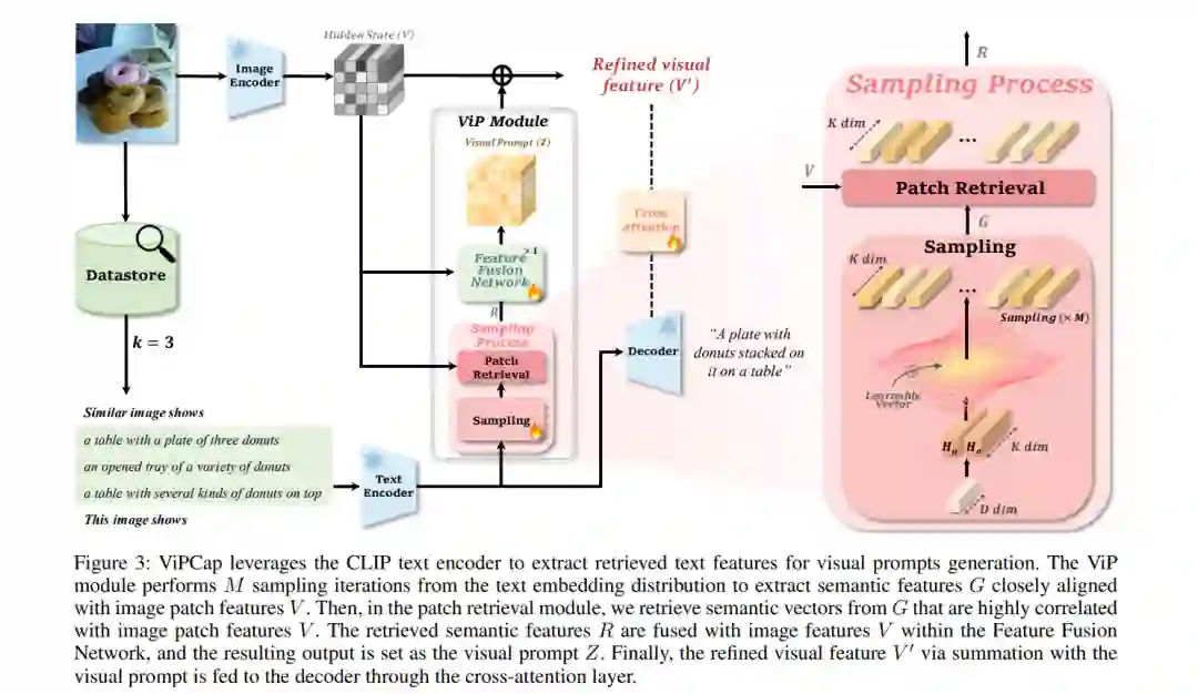 最近的轻量级图像描述模型使用检索数据,主要集中在文本提示上。然而,以往的研究仅将检索到的文本作为文本提示,视觉信息仅依赖于CLIP视觉嵌入。因此,存在一个问题,即提示中固有的图像描述未能充分反映在视觉嵌入空间中。为了解决这一问题,我们提出了ViPCap,一种用于轻量级图像描述的新型基于检索的文本视觉提示。ViPCap利用检索到的文本和图像信息作为视觉提示,增强模型捕捉相关视觉信息的能力。通过将文本提示映射到CLIP空间,并生成多个随机高斯分布,我们的方法利用采样探索随机增强的分布,并有效地检索包含图像信息的语义特征。这些检索到的特征被集成到图像中,并作为视觉提示,进而在COCO、Flickr30k和NoCaps等数据集上提高了性能。实验结果表明,ViPCap在效率和有效性上显著超越了以往的轻量级描述模型,展示了其作为即插即用解决方案的潜力。源代码可在https://github.com/taewhankim/VIPCAP找到。
