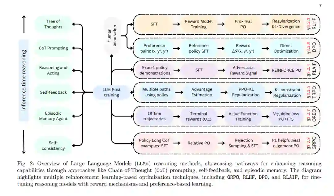 为提升 RL 训练效果,研究者结合过程奖励(process-based rewards)(如思维链推理 Chain-of-Thought Reasoning)和结果评价(outcome-based evaluations)(如生成质量评估)[8, 80, 81],以优化 LLM 学习过程。因此,LLM 的 RL 训练需要专门的优化技术,以处理高维输出、非平稳目标和复杂奖励结构,确保模型生成符合用户期望的上下文相关响应。