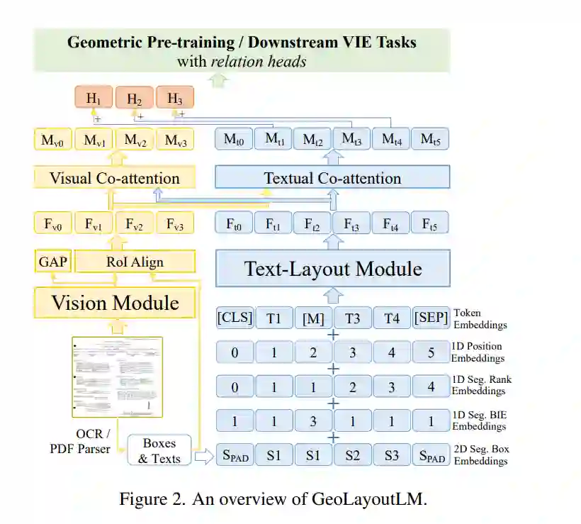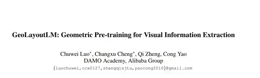 视觉信息提取(VIE)在文档智能领域中扮演着重要角色。通常,它可以分为两个任务:语义实体识别(SER)和关系抽取(RE)。最近,针对文档的预训练模型在 VIE 方面取得了显著进展,特别是在 SER 领域。然而,大多数现有模型以隐式方式学习几何表示,这对 RE 任务来说被认为是不够的,因为几何信息对 RE 尤为关键。此外,我们发现限制 RE 性能的另一个因素在于预训练阶段与 RE 微调阶段之间的目标差距。为了解决这些问题,我们在本文中提出了一种用于 VIE 的多模态框架,名为 GeoLayoutLM。GeoLayoutLM 在预训练阶段显式地对几何关系进行建模,我们称之为几何预训练。几何预训练通过三个专门设计的与几何相关的预训练任务来实现。此外,我们精心设计了新颖的关系头,这些关系头通过几何预训练任务进行预训练,并针对 RE 进行微调,以丰富和增强特征表示。根据对标准 VIE 基准的广泛实验,GeoLayoutLM 在 SER 任务中获得了非常具有竞争力的分数,并在 RE 任务中显著优于先前的最先进方法(例如,RE 在 FUNSD 上的 F1 分数从 80.35% 提高到 89.45%)。