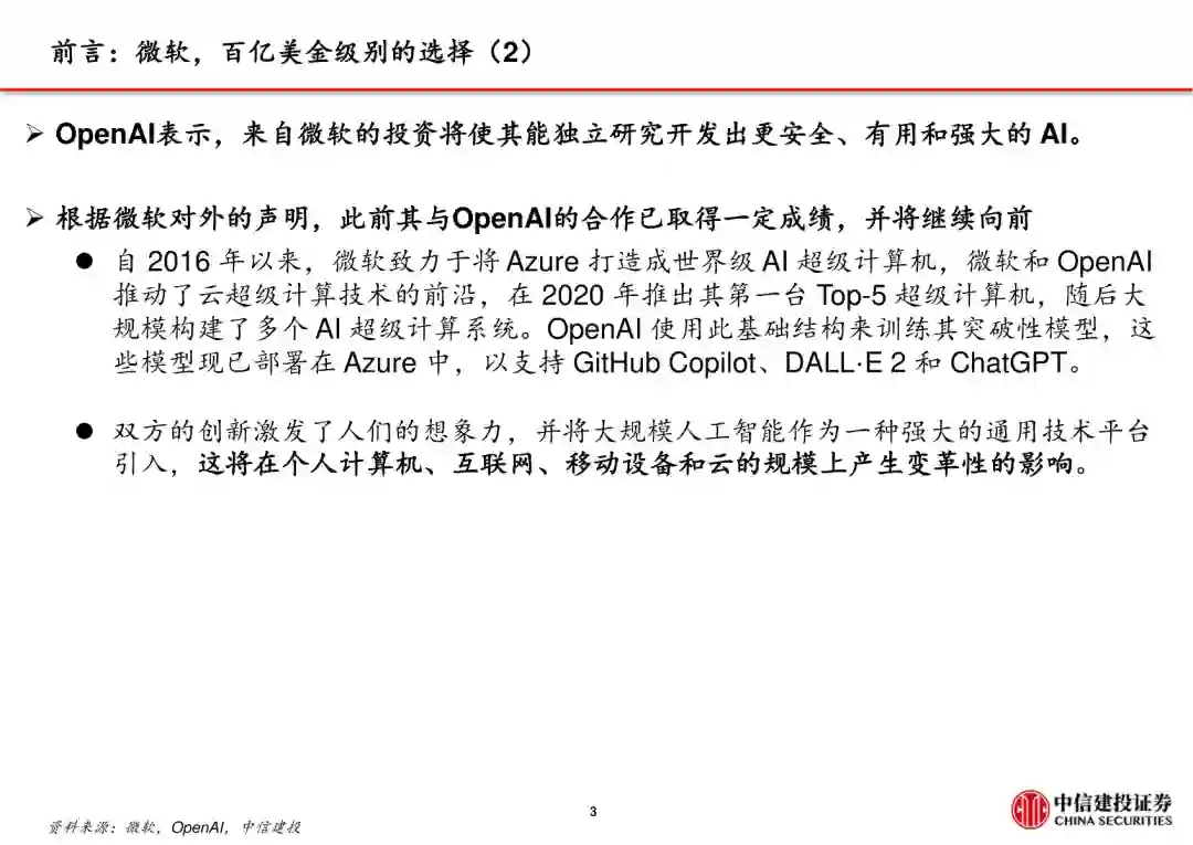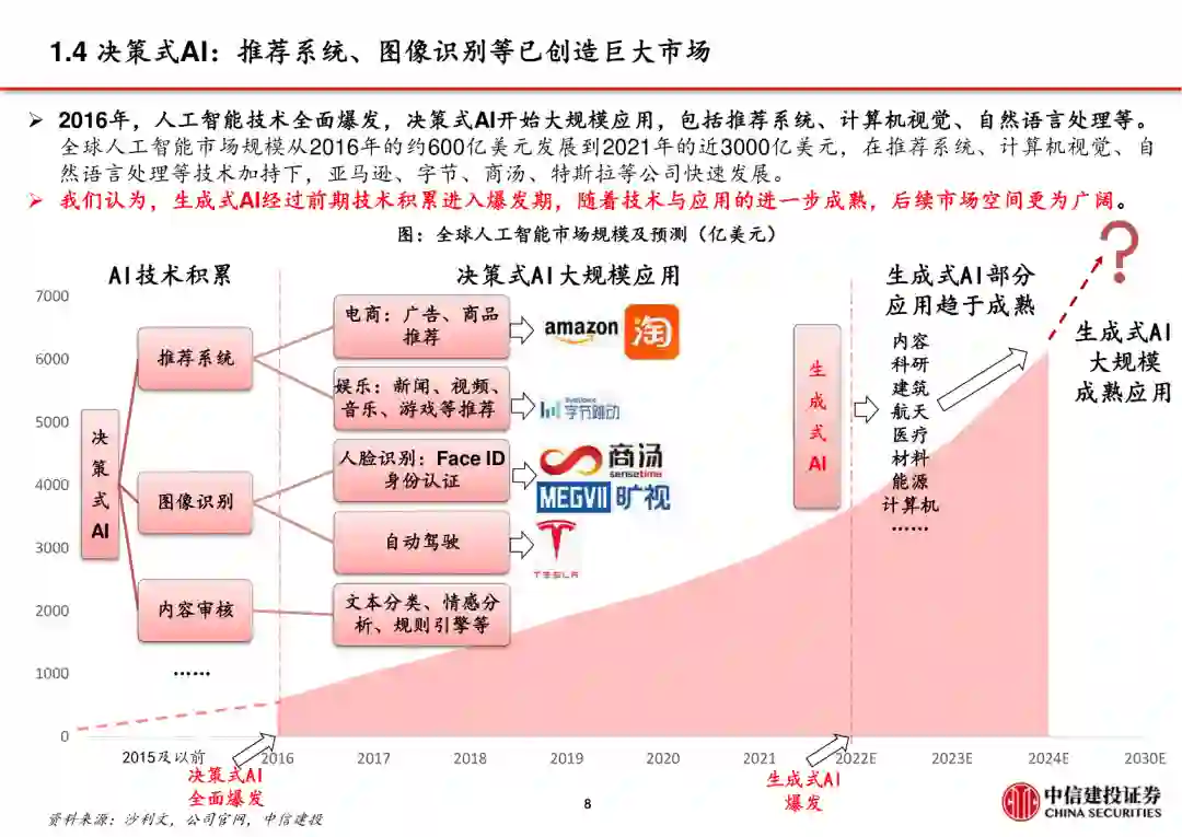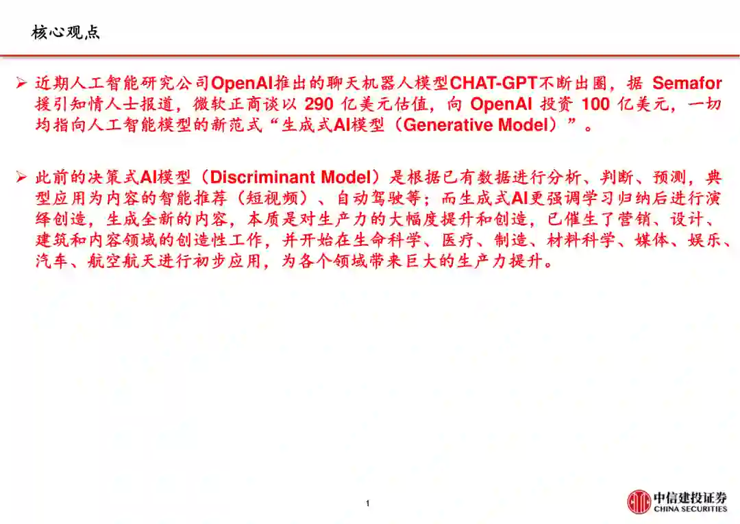 近期人工智能研究公司OpenAI推出的聊天机器人模型CHAT-GPT不断出圈,据Semafor援引知情人士报道,微软正商谈以290 亿美元估值,向OpenAI 投资100 亿美元,一切均指向人工智能模型的新范式“生成式AI模型(Generative Model)”。此前的决策式AI模型(Discriminant Model)是根据已有数据进行分析、判断、预测,典型应用为内容的智能推荐(短视频)、自动驾驶等;而生成式AI更强调学习归纳后进行演绎创造,生成全新的内容,本质是对生产力的大幅度提升和创造,已催生了营销、设计、建筑和内容领域的创造性工作,并开始在生命科学、医疗、制造、材料科学、媒体、娱乐、汽车、航空航天进行初步应用,为各个领域带来巨大的生产力提升。