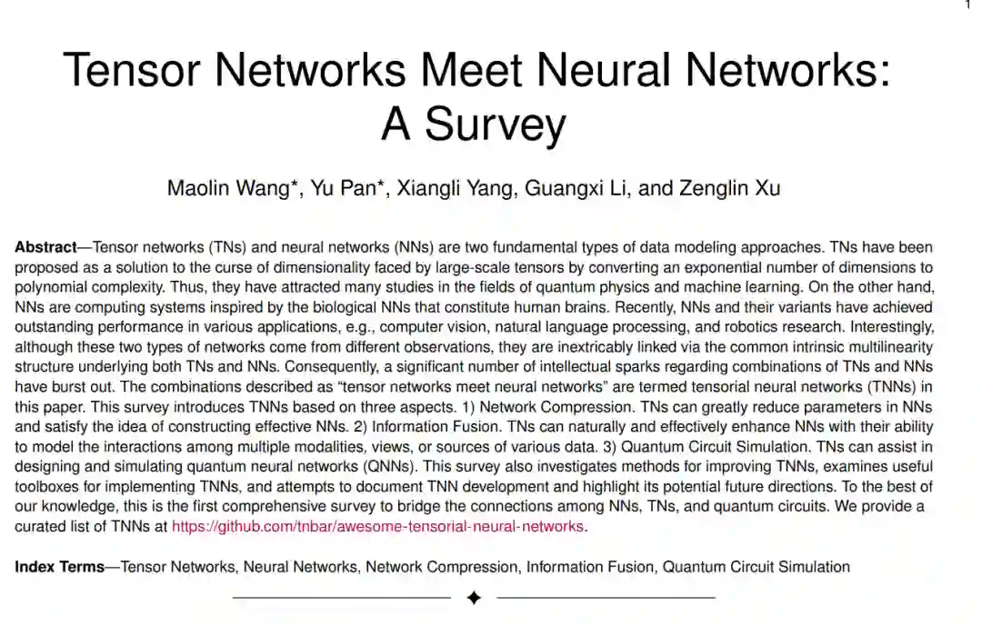 张量网络(TNs)和神经网络(NNs)是两种基本的数据建模方法。TNs通过将指数维数转换为多项式复杂度,被提出作为大规模张量面临的维数灾难的解决方案。因此,它们吸引了量子物理和机器学习领域的许多研究。另一方面,神经网络是受构成人类大脑的生物神经网络启发的计算系统。近年来,神经网络及其变体在计算机视觉、自然语言处理和机器人研究等各种应用中取得了卓越的性能。有趣的是,尽管这两种类型的网络来自不同的观察,但它们通过TNs和NNs共同的内在多线性结构不可避免地联系在一起。因此,出现了大量关于TNs和NN结合的思想火花。将"张量网络与神经网络"的组合称为张量神经网络(tensorial neural networks, TNNs)。**本文从三个方面对TNNs进行了介绍。1)网络压缩。TNs可以大大减少神经网络中的参数,满足构造有效神经网络的思想。2)信息融合。TNs可以自然有效地增强神经网络的能力,对多种模态、视图或各种数据来源之间的相互作用进行建模。3)量子电路仿真。**TNs可以帮助设计和模拟量子神经网络(QNNs)。本综述还研究了改进TNN的方法,研究了用于实现TNN的有用工具箱,并试图记录TNN的发展并强调其潜在的未来方向。据我们所知,这是第一次将神经网络、TNs和量子电路之间的联系联系起来的全面综述。我们在https://github.com/tnbar/awesome-tensorial-neural-networks上提供了一个精心策划的TNNs列表。