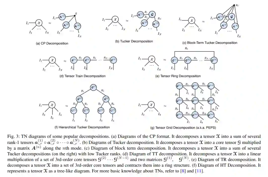 **张量是高阶数组,表示多个模态源之间的多方向相互作用。**相比之下,向量(即一阶张量)和矩阵(即二阶张量)分别只能以一种或两种模式访问。张量作为一种常见的数据类型,在[1],[2],[3],[4]等场景中得到了广泛的观察。例如,功能磁共振成像(fMRI)样本本质上是四阶张量,由随时间变化的三维体素组成[5],[6],[7]。在量子物理中,用于研究多体量子系统的变分波函数也是高阶张量[8],[9]。对于时空交通分析,几周内从多条道路收集的道路流量/速度信息也可以构建为一个三阶张量(road segment×day×time of day)[10]。然而,对于高阶张量,当模态数量增加时,张量中的元素总数呈指数增长,导致存储和处理张量时出现灾难。这种现象也被公认为“维数诅咒”[11]。 张量网络(TNs)。TNs[8],[11],[12]通常是通过张量收缩连接的小尺度张量的可数集合。这些小尺度张量被称为“分量”、“块”、“因子”或“核心”。非常大规模的张量可以通过TNs以极度压缩和分布式的格式近似表示。因此,对以前无法处理的高阶张量进行分布式存储和高效处理是可行的。通过TN方法,可以缓解或完全克服[11]的维数灾难问题。常用的TN格式包括CANDECOMP/PARAFAC (CP)[13]、[14]、[15]、Tucker分解[16]、[17]、Blockterm Tucker (BTT)分解[18]、[19]、[20]、矩阵积态(MPS)/张量列(TT)分解[21]、[22]、[23]、[24]、矩阵积算子(MPO)/矩阵张量列(mTT)分解[21]、[22]、[23]、[24]、张量环(TR)分解[25]、树TN/层次Tucker (HT)分解[26]、投影纠缠对态(PEPS)/张量网格分解[8]、[27],[28],多尺度纠缠重整化[29]等。为了理解TNs相互关联的结构,TN图被开发为一种简单的图形图(将在2.2节讨论)。TN可以为分析一些计算上不可接受的任务提供一个理论和计算框架。例如,Pan等人基于TNs的低秩结构,[30]能够在15小时内使用512个图形处理器(GPU)解决量子随机电路采样问题;这个问题之前被认为在最强大的经典电子超级计算机上需要超过10000年的时间,并有效地挑战了谷歌的量子计算机“Sycamore”的量子霸权。其他应用包括脑分析[31]、量子化学计算[32]、人脸聚类[33]、降维[34]、缺失值估计[35]、潜在因子分析[36]、子空间学习[37]等。