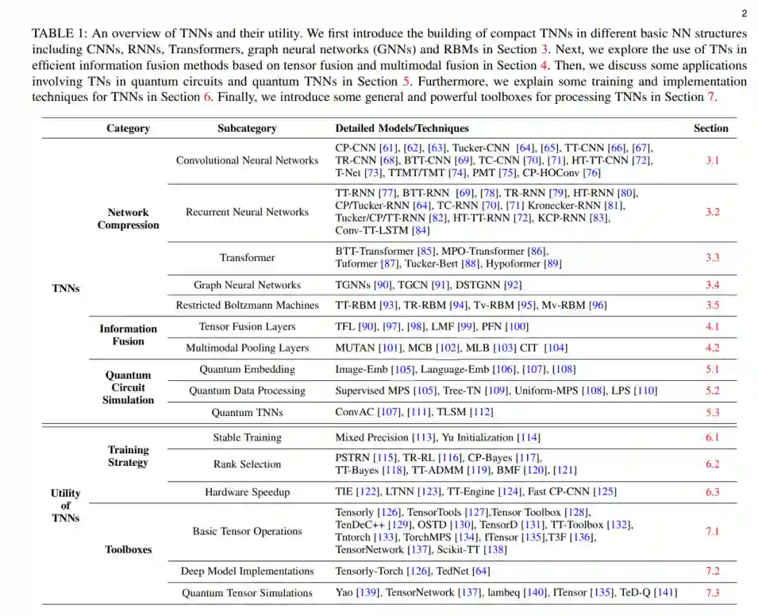 我们将这种连接TNs和NNs的方法族称为张量神经网络(TNNs)。据我们所知,这是第一次将神经网络、TNs和量子电路之间的联系联系起来的全面综述。TNN及其效用的概述如表1所示。本综述的其余部分组织如下。第2节提供了张量符号、张量图和TN格式的基础知识。第3节讨论如何使用TNs来构建紧凑的TNN。第4节探讨了使用TNN的高效信息融合过程。第5节讨论了TNs在量子电路和TNNs中的一些基本应用。第6节解释了TNNs的一些训练和实现技术。第7节介绍了可用于处理TNN的通用而强大的工具箱。