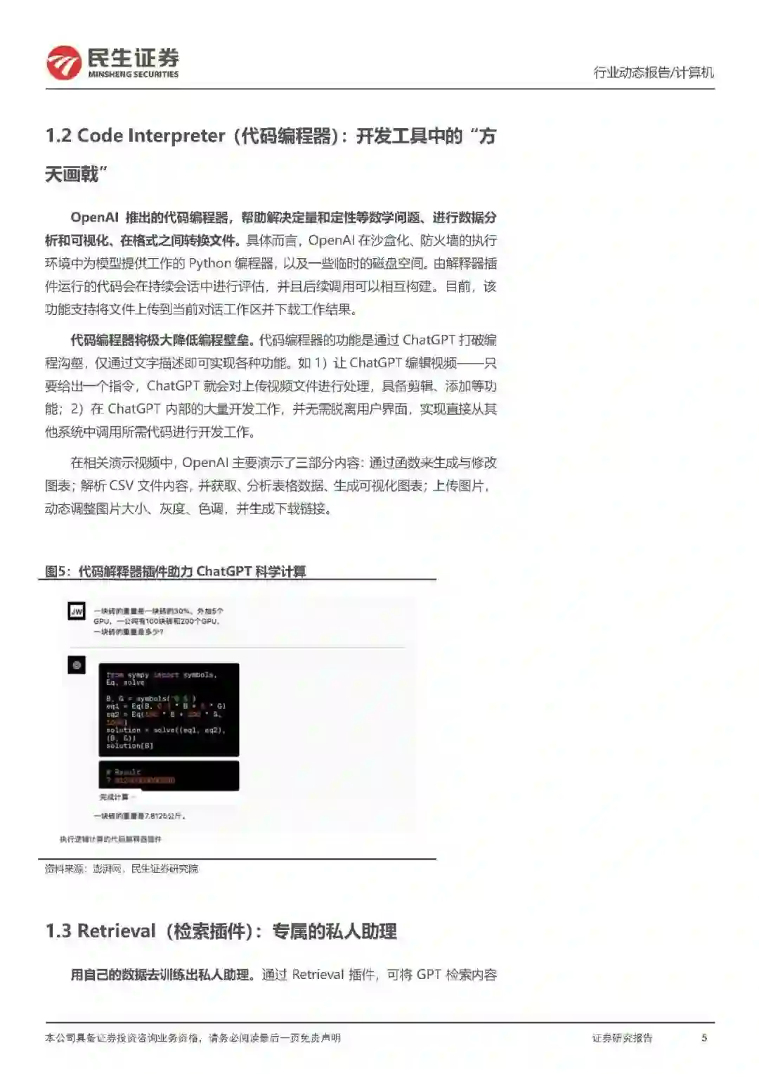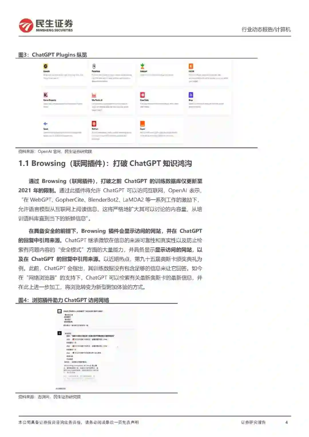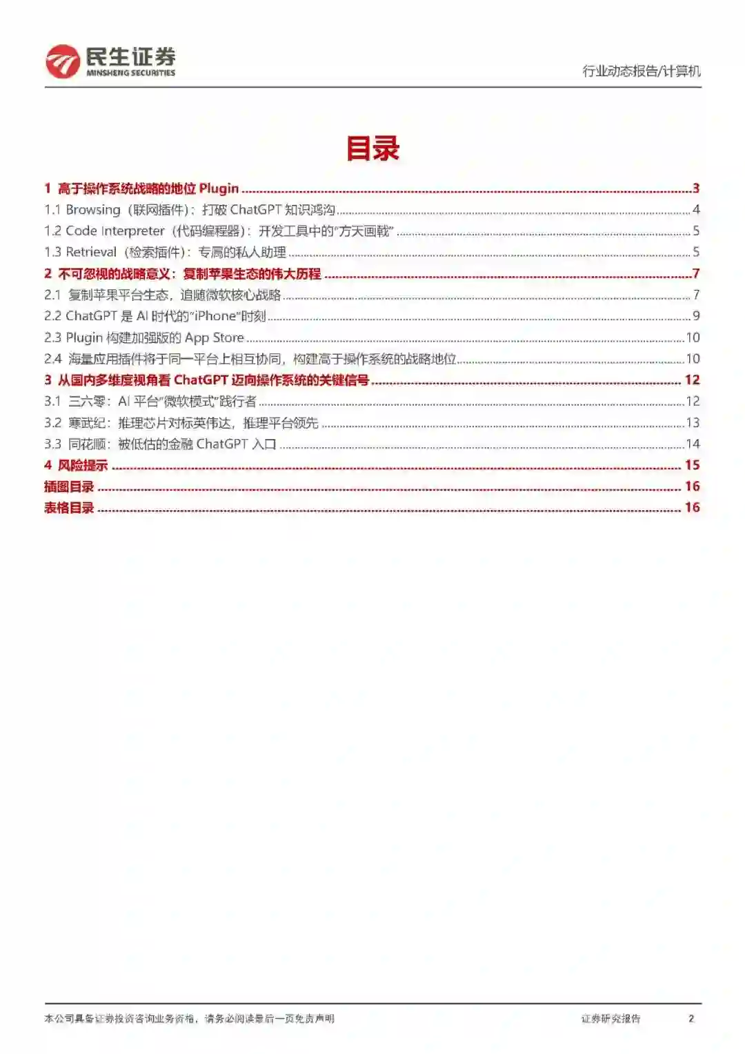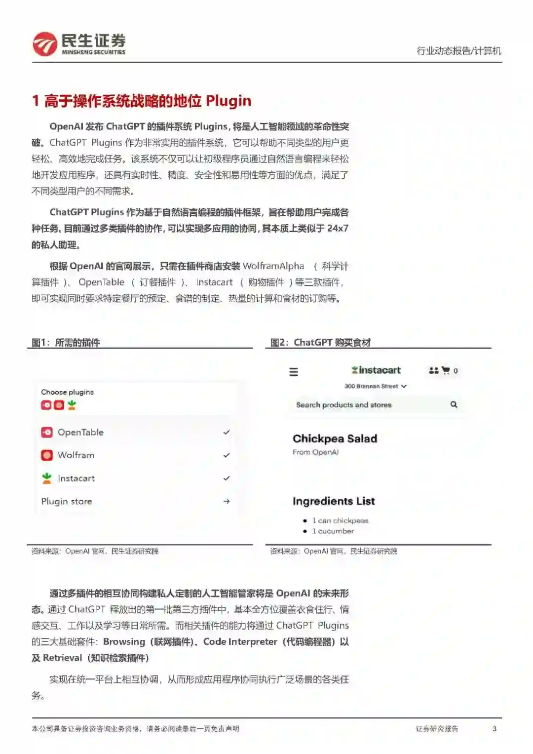 ChatGPT plugin生态伙伴正在愈发繁荣,已知插件的功能包括制定旅游计算、收集财政票据、网上订购、预定餐厅、数学计算等各个方面,包括人们日常应用等各个部分。Plugin已经具备“AI助手”的能力:1、ChatGPT Plugin可以及时更新实时信息;2、ChatGPT Plugin更具有服务化的意识;3、办公领域中,扮演更加类似“助手”的作用,此外Plugin调用极其便捷,我们认为功能类似微信的“小程序”;此外,Plugin创建第三方插件同样方便快速。 我们认为Plugin意义非凡,打开海量应用空间。Plguin的出现正式成为引爆“AI+”的关键导火索,各类应用有望快速接入“大模型”,从而使“AI+”赋能千行百业,使用者可以通过插件的方式让客户通过简单自然语言的对话,就可以完成复杂的任务,比如文档操作、编程、预定参订、食材等操作;此外,我们认为Plugin的商业模式与苹果APPStore有异曲同工之妙,Plugin的出现即为AI时代的流量和客户的入口。我们认为AI加速赋能应用的时代已经到来,目前来看,大模型的赋能应用的场景只限于自然语言处理,我们认为未来计算机视觉、多模态、生物计算同样有望引爆应用市场,同时,我们认为未来5-10年内,所有的科技应用有望在大模型的加持下大放异彩,包括医疗、教育、办公、工业等多方面。 高于操作系统战略的地位 Plugin。 通过多插件的相互协同构建私人定制的 人工智能管家将是 OpenAI 的未来形态。通过 ChatGPT 释放出的第一批第三方插件中,基本全方位覆盖衣食住行、情感交互、工作以及学习等日常所需。而相关插件的能力将通过 ChatGPT Plugins 的三大基础套件: Browsing(联网插件)、Code Interpreter(代码编程器)以及 Retrieval(知识检索插件) 目前通过多类插件的协作,可以实现多应用的协同,其本质上类似于 24x7 的私人助理。 不可忽视的战略意义:复制苹果生态的伟大历程。 OpenAI 正沿着类苹果模式的“终端+平台+生态”,迈向高于操作系统的战略地位。引入插件 Plugin 标志 ChatGPT 走在创建生态系统的伟大道路上,统一平台+插件的模式有望构建与苹果+App Store 相似的繁荣生态。复盘苹果生态模式发展进程,我们发现ChatGPT 已经具备全部的先决条件: 通过 ChatGPT 划时代的交互方式抢占终端的制高点,对标 iPhone 4 发布;发布 Plugin 并推出“交互+编程+个人助手”三大套件,对标 APP Store 模式,打造苹果式的手机体验; 宣布接入海量应用插件,在统一平台上形成功能相互协同=App Store 通过排行榜、搜索等方式帮助 iPhone 用户快速找到想要的应用程序的 “苹果平台”商业模式。 ChatGPT 自身的三大套件是构建海量插件相互协同的核心抓手,其目的是通过将多插件形成对用户的全方位覆盖,最终形成专属个人的 AI 管家。 从ChatGPT 的首批接入的插件厂商即可看出 OpenAI 的目标是覆盖人类生活的全维度。通过调节和协作相关插件, ChatGPT 从本质上转变为每个人的私人助理。当个人可以通过同一平台同时安排衣食住行、工作、娱乐乃至教育的任务部署,将构建不可打破的高粘性,并反哺于 GPT 模型的优化,最终进一步扩展ChatGPT-PlugIn 的战略宏图。