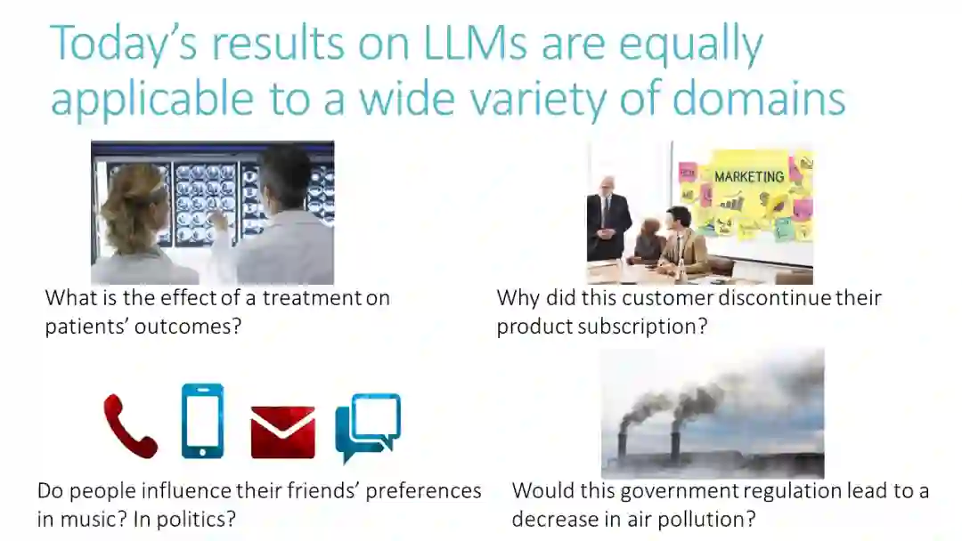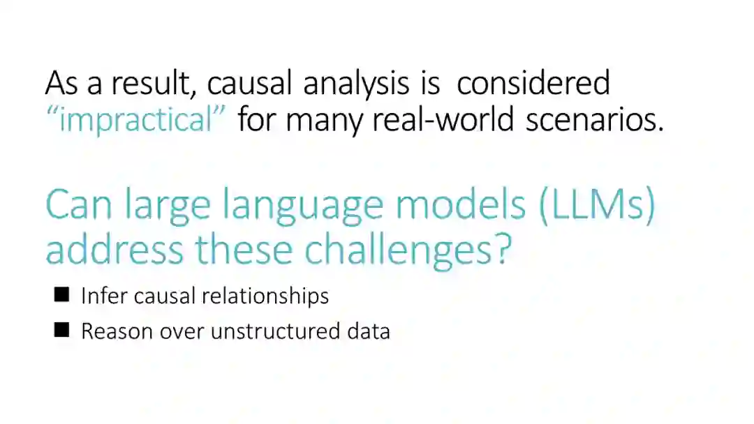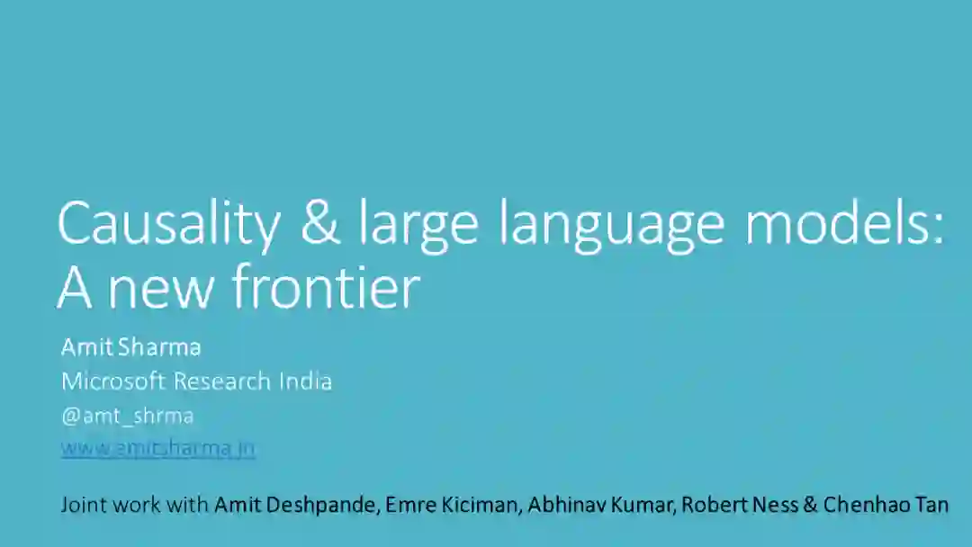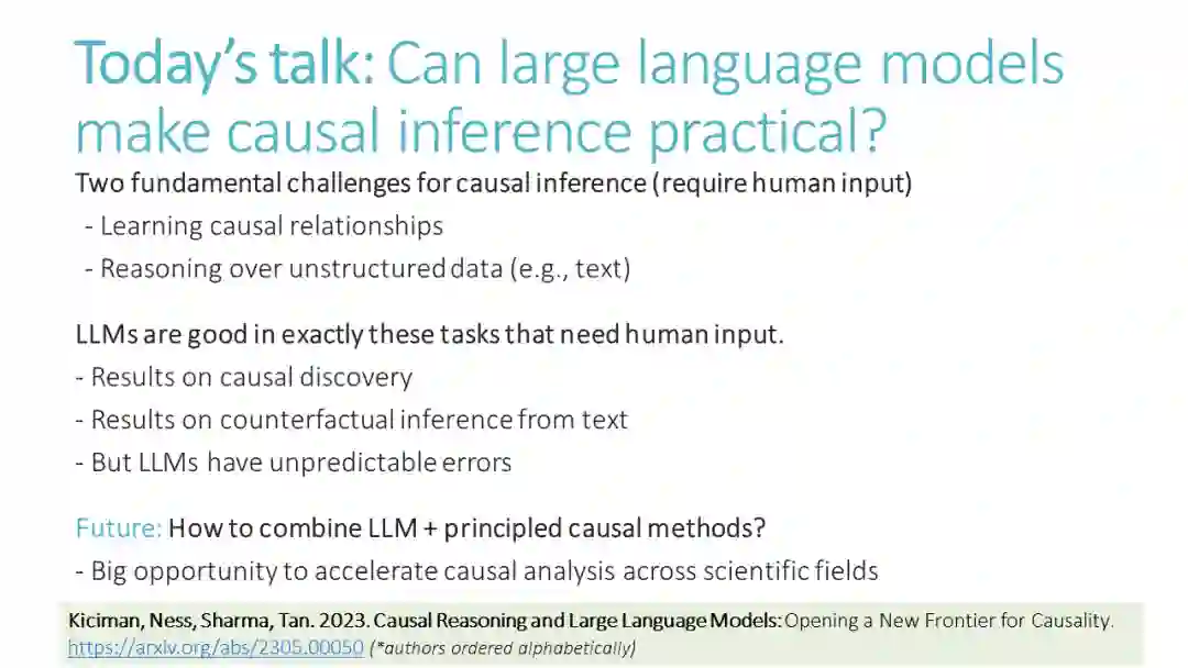 在进行因果分析的关键挑战是,确定正确的假设(如因果图)需要大量的手动努力。由于不能仅从数据中学习因果图,领域专家面临着提供并验证潜在因果关系的困难任务。在本次演讲中,我将讨论大型语言模型(LLMs)如何提供到目前为止被认为仅限于领域专家的新功能,例如推断因果关系的方向,识别任何缺失的关系,或验证因果分析中的基础假设。首先,我将展示LLMs在因果图发现方面的成果。基于GPT-3.5和4的算法在多种数据集上表现优于现有算法:涵盖物理学、工程学、生物学和土壤科学等领域的Tuebingen成对数据集(97%,13点增益)、北极海冰覆盖数据集(0.22汉明距离,11点增益)以及医疗疼痛诊断数据集。我们发现LLMs通过依赖如变量名等信息来推断因果关系,这一过程我们称之为基于知识的推理,它与非LLM基础的因果发现是不同且互补的。其次,我将描述这些LLMs的功能如何可以扩展用于因果推断流程中的有用任务:识别任何缺失的混淆变量,建议工具变量,建议可验证因果分析的特殊变量(如负对照),以及关于根本原因归因的推理。与此同时,LLMs展示了不可预测的故障模式,我将提供一些解释它们稳健性的技术,特别是与数据集记忆有关。展望未来,通过捕捉关于因果机制的领域知识,LLMs可能为推动因果推理研究开辟新的前沿,并促使因果方法的广泛采用。