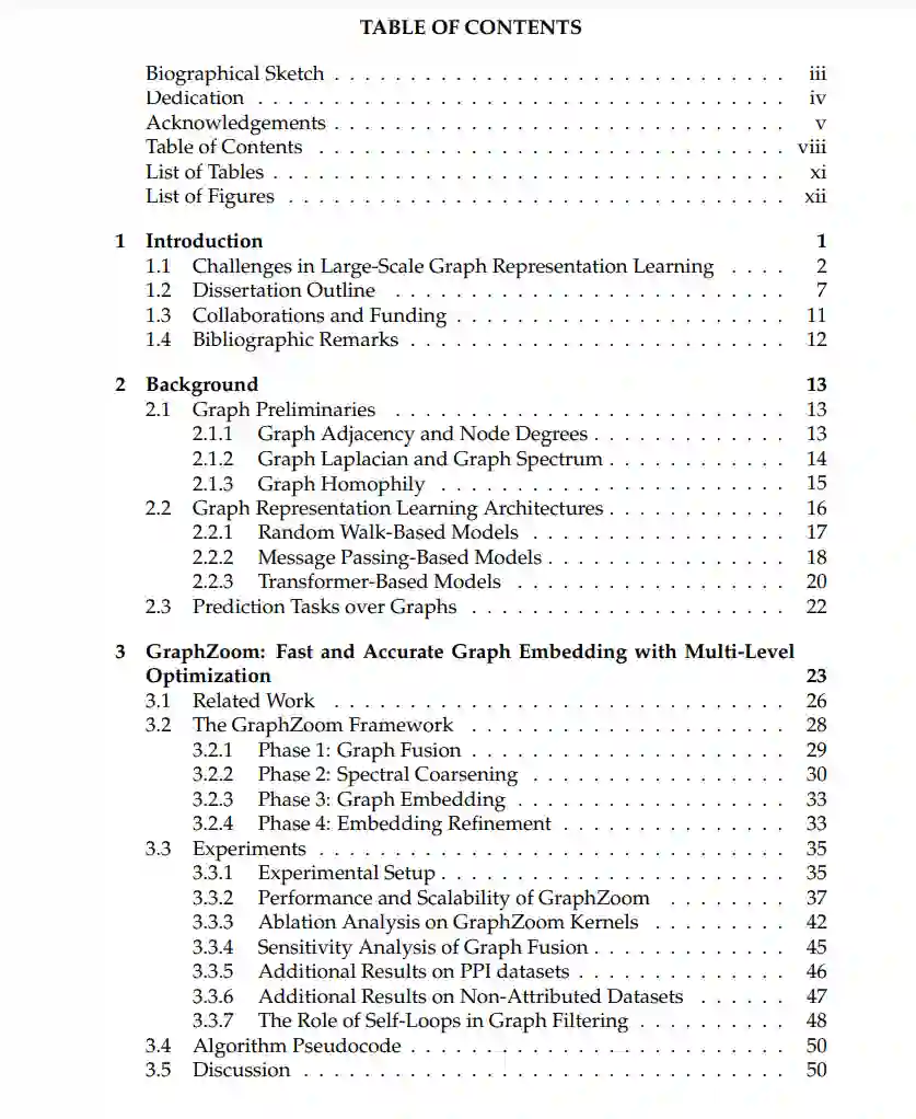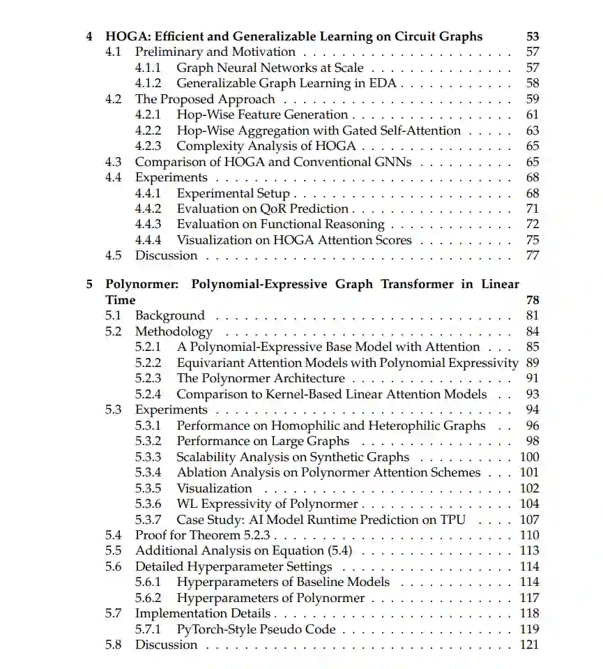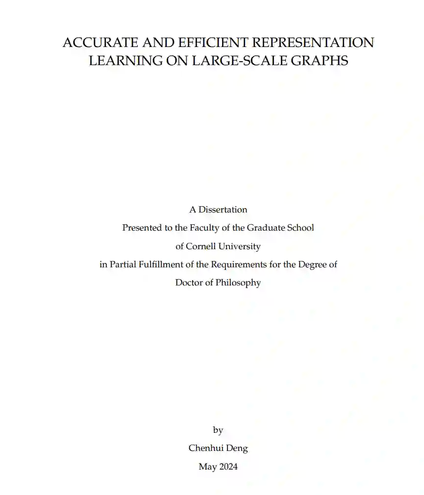 近年来,图结构数据的表示学习受到了广泛关注,这些数据在多种现实世界领域中广泛存在,涵盖了基础物理交互、生物系统、社交网络和逻辑电路等领域。然而,现有的图表示学习(GRL)模型在准确性和效率之间存在较大的矛盾。 首先,许多现实世界中的图(例如社交网络和逻辑电路)通常非常庞大,包含数百万甚至数十亿个节点和边,这对模型在训练和部署过程中的效率构成了巨大的挑战。此外,不同领域的图结构复杂且多样,同时也容易受到对抗性攻击,这些攻击通过添加或删除节点和边来扰乱图的拓扑结构。这些图的特性要求模型架构足够复杂,以生成高质量的图表示,而这往往伴随着巨大的计算开销和内存消耗。 在本论文中,我们提出了针对大规模图应用的可扩展、硬件友好、富表现力和鲁棒的图表示学习模型的研究解决方案。我们首先提出了 GraphZoom,一种快速准确的多级图表示学习方法。GraphZoom 利用轻量级算法,通过迭代减少图的规模,并基于谱图理论逐步精炼图表示,从而在保证理论精度的同时,大幅提升训练速度。与现有方法相比,GraphZoom 实现了 40.8 倍的训练加速,同时保持了相当甚至更好的准确性。 其次,我们开发了 HOGA,一种面向大规模电路图的可扩展且具有普适性的图表示学习方法,通过采用基于跳跃的图注意力机制(hop-wise graph attention scheme)。HOGA 不仅在挑战性的电路问题上超越了现有的图表示学习模型,而且通过减少图依赖带来的通信开销,能够更好地支持分布式训练,从而适用于工业规模的电路应用。 第三,我们提出了 Polynormer,一种具有线性复杂度的富表现力图变换器模型。我们从多项式函数的角度理论证明了 Polynormer 在表达能力上的优势。我们的广泛实验表明,Polynormer 在多种主流图数据集上达到了最先进的结果,并且在 Google 提供的工业规模数据集上,预测 TPU 上 AI 模型运行时的任务时,比流行基准模型提高了 31.8%。 最后,我们提出了一种高效的图拓扑学习方法 GARNET,用于应对图对抗攻击下的准确图表示学习。我们通过理论分析表明,GARNET 能够在接近线性复杂度下有效恢复来自对抗性图中的关键结构,这使得其在广泛的对抗图数据集上相较于先前的鲁棒图表示学习模型,准确性提高了最多 10.23%。