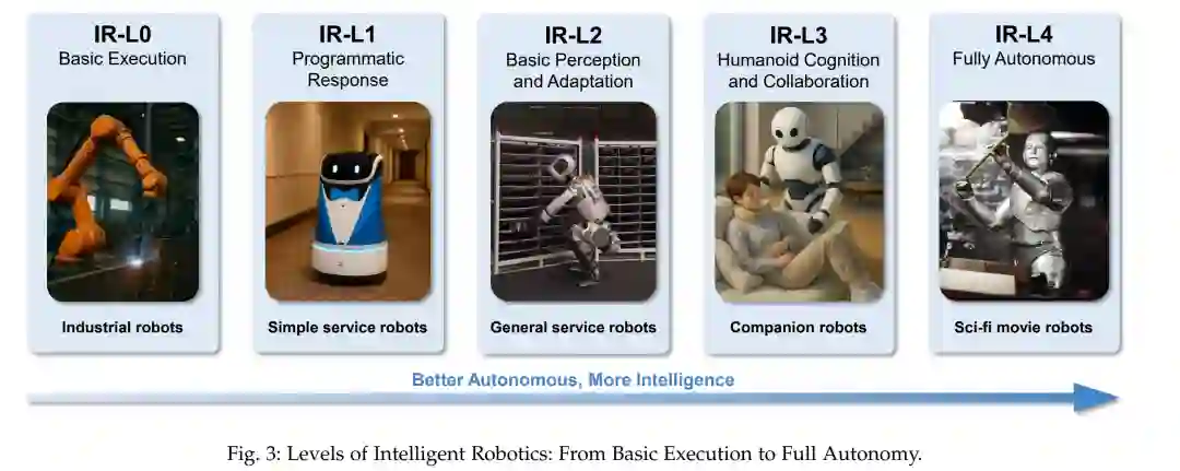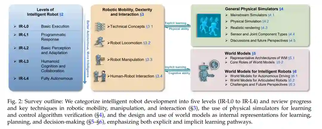 智能机器人能力分级标准: 提出一个涵盖自主性、任务处理能力、环境适应能力与社会认知能力四个关键维度的五级能力分级体系(IR-L0 至 IR-L4)。 * 机器人学习技术分析: 系统回顾智能机器人在腿式运动(如双足行走、摔倒恢复)、操作控制(如灵巧操作、双手协调)与人机交互(如认知协作、社会嵌入)方面的最新技术进展。 * 主流物理模拟器分析: 全面对比 Webots、Gazebo、MuJoCo、Isaac Gym/Sim/Lab 等主流模拟器的物理仿真能力、渲染质量与传感器支持能力。 * 世界模型的最新进展: 首先回顾世界模型的代表性架构及其潜在作用,例如作为可控模拟器、动态建模器与奖励模型在具身智能中的应用。进一步探讨专为自动驾驶与关节型机器人设计的最新世界模型方案。