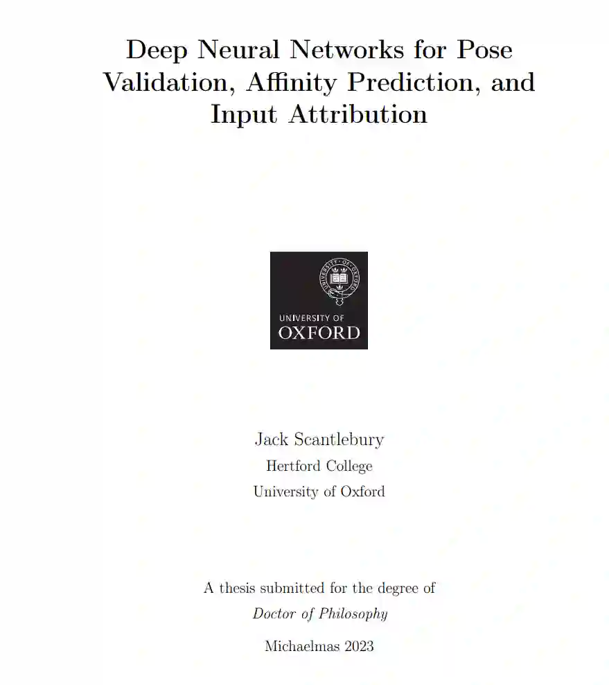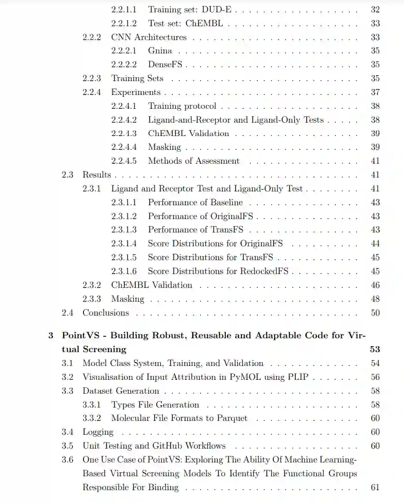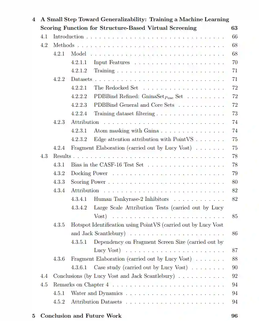 第三章涉及到PointVS设计和工程决策。这是一个用于姿态分类和亲和力预测的图神经网络快速原型设计和测试的软件包。它包括各种辅助任务的脚本,如数据集生成、输入归因可视化和日志记录,并已被牛津蛋白质信息学组的另一名成员用于一篇简要描述的论文。PointVS是另一篇在写作时正在审查中的出版物的基础;这构成了第四章。与另一名学生合作,图神经网络被用于姿态分类和亲和力预测,训练集和测试集被仔细设置以避免信息泄露。PointVS与几种其他方法进行了比较,取得了有竞争力的表现。从PointVS获得的归因得分被转换为蛋白质热点图,这些热点图被用作片段扩展的生成模型的输入。这一结果优于使用标准物理导出的热点图的结果,这证明了图神经网络可以挑选出重要的蛋白质-配体相互作用。最后,我们从宏观的角度看待基于机器学习的评分函数领域。我们得出结论,尽管这些方法有前景,但为了训练真正“理解”蛋白质-配体结合的宇宙的模型,必须克服几个障碍。我们建议将输入归因真实测试集作为一个可能的进一步研究领域,并确定了一个可能的生成方法。我们得出结论,许多关于机器学习评分函数相对于其基于物理启示的前身的改进都被高估了,并且需要一个明确考虑到水的更动态的结合视图。