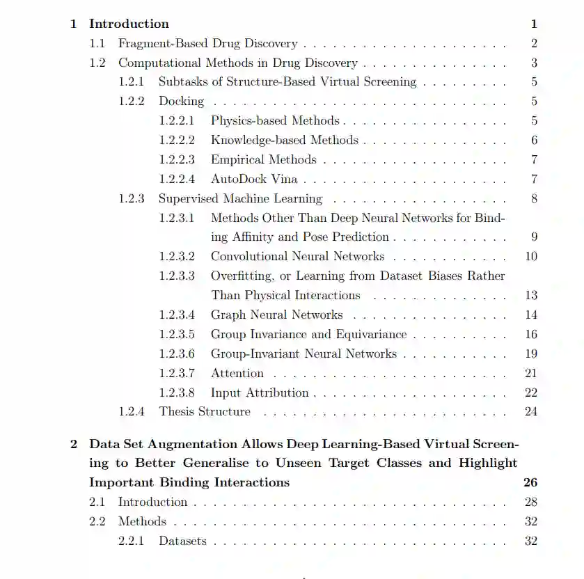 寻找与特定蛋白质强烈结合的药物分子是药物发现过程的一个组成部分。为此,已经开发了旨在计算机内部筛查大量潜在结合体的虚拟筛查算法。这些算法使用评分函数来评估计算预测的结合姿态的正确性,并预测结合亲和力。近年来,研究已转向基于深度学习的评分函数,这些函数使用结合数据建立结合行为模型;这是本论文的主题。第一章是对与后续章节相关的概念和文献的介绍。这包括基于片段的药物发现、虚拟筛查以及虚拟筛查中的机器学习方法。它还涉及到输入归因问题,即为基于深度学习的评分函数的输入中的原子或键分配重要性,以及机器学习算法基于数据集偏见进行分类而不是学习控制蛋白质-配体结合的物理相互作用的问题。第二章的大部分内容是关于虚拟筛查的卷积神经网络的发表。使用几个实验探索了学习训练集偏见而不是物理相互作用的问题,并提出了一种数据集增强的方法来对抗这种效果。一个精心策划的验证集,独立于任何训练数据进行构建,被用来显示在分类决策中增加了对蛋白质信息的使用;在几个案例研究上使用输入归因来证明这一点。