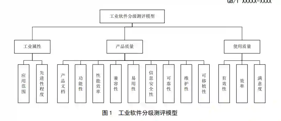 工业软件的分级测评模型分为工业属性、产品质量和使用质量三方面,见图1。工业属性主要考虑 工业软件作为工业产品所具备的属性,考虑工业软件在解决工业问题的能力及所封装的工业知识方面 的要求;工业软件的软件属性主要考虑其作为一个软件产品所具备的质量,依据GB/T AAAAA-XXXX中的 要求进一步细分为产品质量和使用质量两方面,其中产品质量用于评价工业软件产品作为软件本身的 能力,并根据分级的情况对GB/T AAAAA-XXXX中的要求进行了细化;软件使用质量用于评价工业软件产 品在使用过程中呈现的软件能力,并对GB/T AAAAA-XXXX中的要求进行了裁剪。