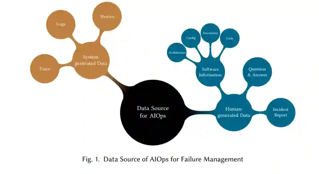 如今,软件系统变得日益复杂。这些系统通常为数以亿计的用户提供服务,即使是轻微的软件故障也会因服务中断或服务质量下降而导致重大损失。因此,大规模分布式软件系统需要确保24/7不间断服务,具备高可用性和可靠性。然而,由于其庞大的规模和复杂的操作逻辑,这些软件系统经常会遇到难以检测、定位和诊断的故障。一旦发生故障,分析和调试系统错误变得更加困难。因此,提高故障诊断效率,快速识别系统故障,定位根本原因,并及时修复它们,对于确保大规模分布式软件系统的高可用性和可靠性至关重要。 随着人工智能(AI)的发展,Gartner在2016年首次提出了IT运维的人工智能(AIOps)[103]。AIOps利用机器学习(ML)或深度学习(DL)算法分析来自各种操作工具和设备的大量数据,实时自动检测和响应系统问题,从而增强了信息技术(IT)运维的能力和自动化水平。因此,AIOps故障管理(FM)已成为确保软件系统高可用性和可靠性的主流方法。