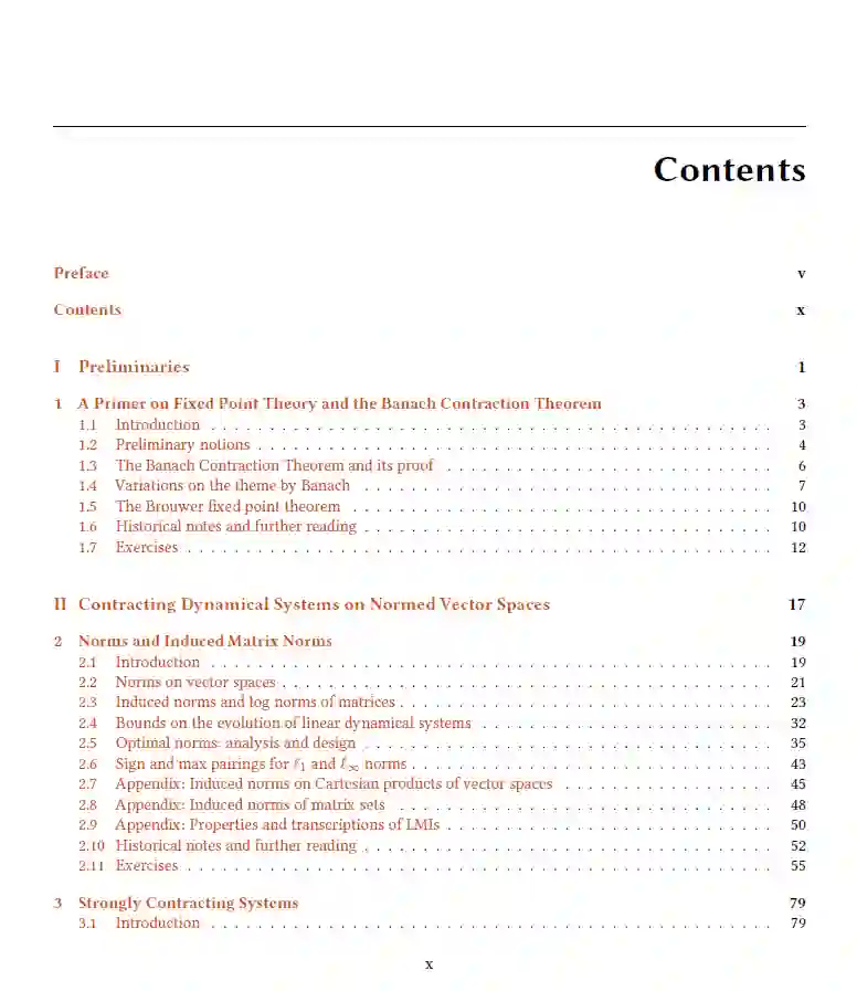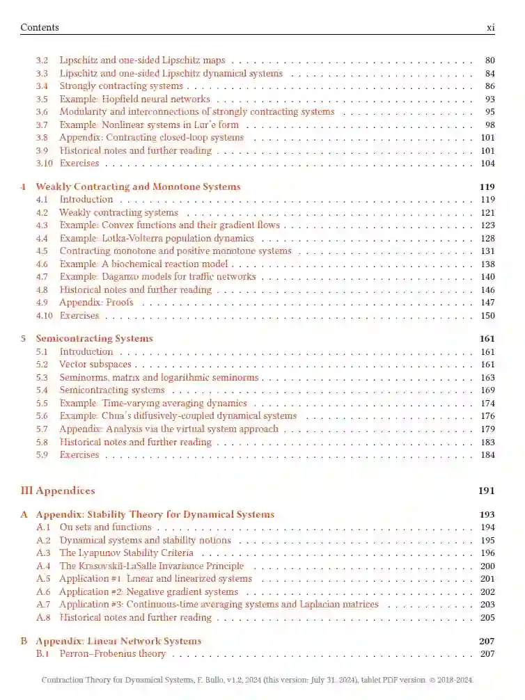 这些讲义为动力系统的收缩理论提供了数学上的入门介绍,特别强调了在网络多智能体系统、单调动力学和半收缩系统研究中出现的连续时间微分方程。本文档为2024年8月1日发布的1.2版本。 讲义涵盖的内容包括: (i) 矩阵的诱导范数和对数范数的流形性质; (ii) 赋予欧几里得范数和非欧几里得范数的有限维向量空间上的收缩动力学; (iii) 弱收缩动力学和单调动力学; (iv) 半收缩系统、正交收缩系统以及部分收缩系统。 本文详细介绍了许多实例,包括:霍普菲尔德(Hopfield)神经网络、Lure形式系统、互联收缩系统、凸函数的梯度流和原始-对偶流、Lotka-Volterra种群动力学、Daganzo交通模型、平均流以及扩散耦合的同步系统。 https://fbullo.github.io/ctds/
