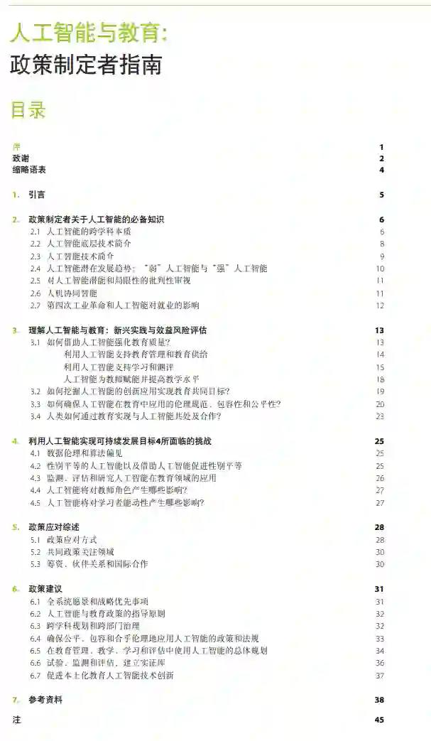 本出版物开篇讲述人工智能的相关必备知识:定义、底层技术和技术应用。然后,详细分析人工智能新兴趋势及其对教学的影响,包括我们如何确保人工智能技术在教育中的应用合乎伦理、包容和公平,教育如何能够帮助人类与人工智能共处与合作,以及如何发掘人工智能潜力促进教育发展。最后,本出版物论述了利用人工智能实现可持续发展目标4所面临的挑战,并且为政策制定者因地制宜规划政策和项目提供切实可行的建议。