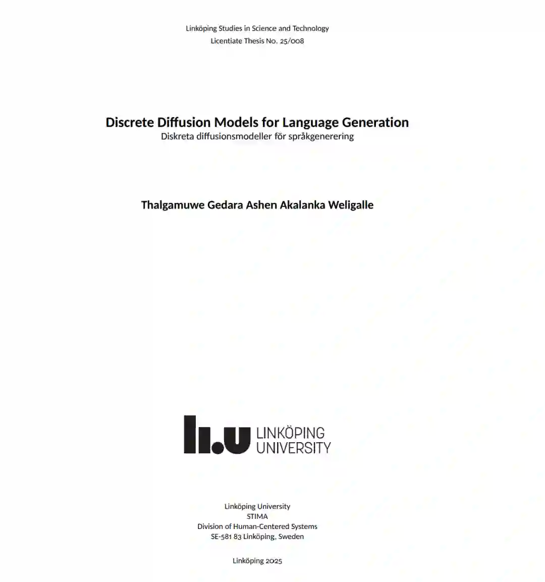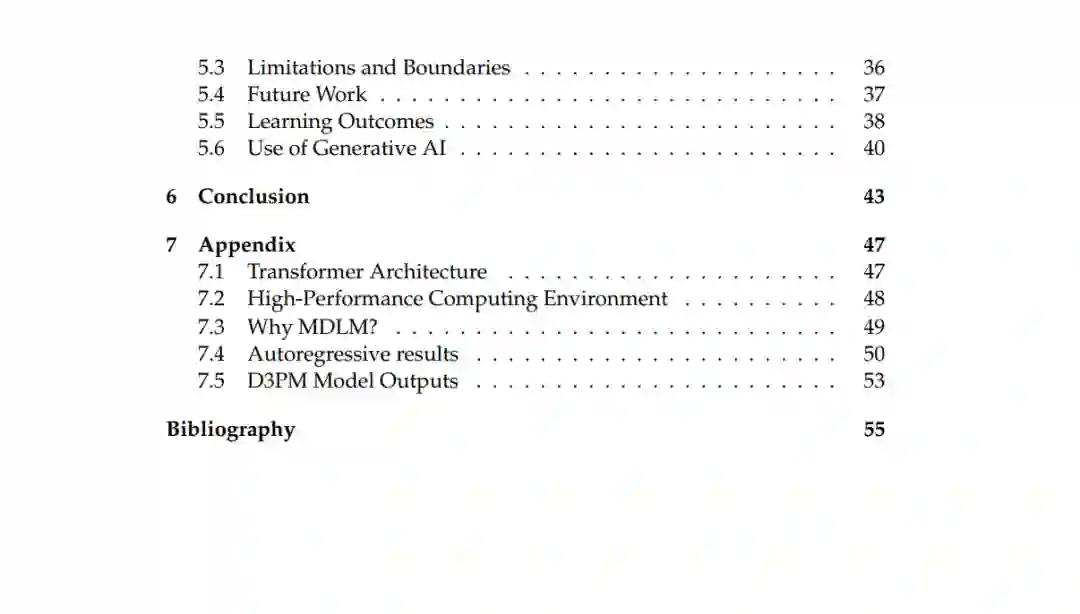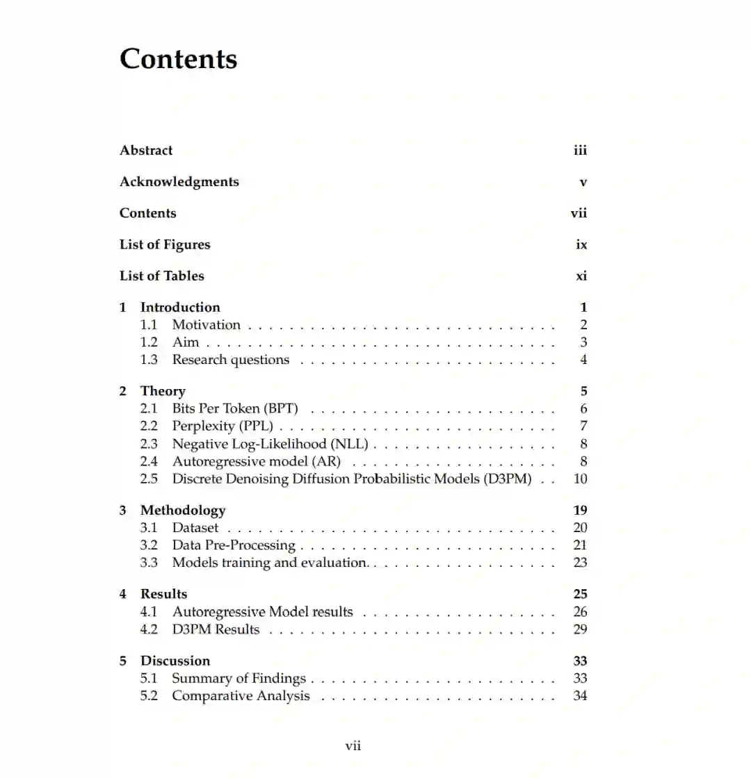 扩散模型作为一类强大的生成模型,在图像合成、视频生成等连续数据领域取得了最先进的性能。其核心机制包括一个正向扩散过程——逐步将结构化数据转化为类高斯分布——以及一个学习得到的反向扩散过程,用于重建原始数据。尽管该框架在连续模态上已被证明是有效的,但将其应用于离散数据,尤其是自然语言,仍是一个具有挑战性且研究活跃的课题【1】。主要难点包括建模离散标记之间的依赖关系的复杂性,以及缺乏自然定义的生成顺序。 本论文研究了离散扩散模型在自然语言生成中的可行性与性能表现。具体而言,我们考察了**离散去噪扩散概率模型(Discrete Denoising Diffusion Probabilistic Model,D3PM)2.5,并将其性能与传统的自回归(Autoregressive,AR)2.4语言模型进行了对比。为评估和比较两种模型的生成能力,我们使用了诸如每个标记的比特数(Bits Per Token, BPT)**2.1、**负对数似然(Negative Log-Likelihood, NLL)**2.3、**困惑度(Perplexity, PPL)2.2以及批处理速度(Batch Processing Speed)**等常见指标。 实验结果【4】表明,表现最好的 D3PM 模型在 BPT 上达到了 5.72,平均值为 8.05。相比之下,AR 模型的平均 BPT 为 4.59,表明其在压缩效率和生成效率方面更具优势。然而,D3PM 模型在批处理速度方面表现更优,最高可达每秒 3.97 个批次,显示出其在并行生成方面的潜力。 所有评估均在统一条件下进行——每个模型生成 100,000 个标记,批次大小固定为 4——以确保公平和可比性。本研究提供了扩散模型与自回归模型的详细对比分析,揭示了它们各自的权衡与差异。最终,研究结果既突显了扩散模型在离散序列建模方面的潜力,也指出了其当前的局限性,为未来在非自回归语言生成框架中的探索奠定了基础。本研究所使用的源码已开源,仓库地址为: https://github.com/AshenWELI/Discrete-Diffusion-Models-for-Language-Genaration。