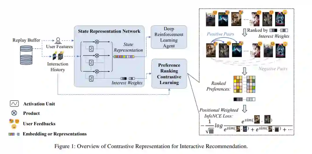 互动推荐(IR)最近因其能够迅速捕捉动态兴趣并优化短期和长期目标而受到广泛关注。IR代理通常通过深度强化学习(DRL)实现,因为DRL本质上与IR的动态特性兼容。然而,DRL目前并不完全适用于IR。由于动作空间庞大和样本效率低下的问题,训练DRL推荐代理是一个挑战。关键问题在于,无法提取有用的特征作为高质量表示,供推荐代理优化其策略。为了解决这个问题,我们提出了用于互动推荐的对比表示(CRIR)。CRIR能够高效地从显式交互中提取潜在的高级偏好排序特征,并利用这些特征来增强用户表示。具体来说,CRIR通过一个表示网络提供表示,并通过我们提出的偏好排序对比学习(PRCL)进行优化。PRCL的关键理念是,它可以在不依赖于涉及高级表示或庞大潜在动作集的计算的情况下进行对比学习。此外,我们还提出了一种数据利用机制和代理训练机制,以更好地将CRIR适应于DRL骨架。通过广泛的实验,我们的方法在训练基于DRL的IR代理时,展现了在样本效率上的显著提升。 https://arxiv.org/abs/2412.18396