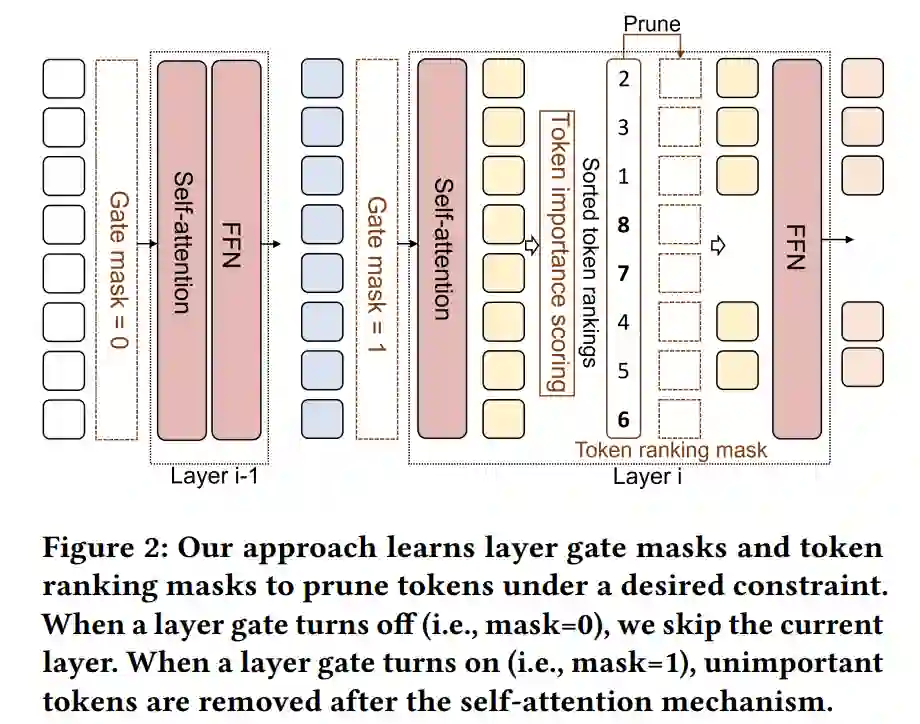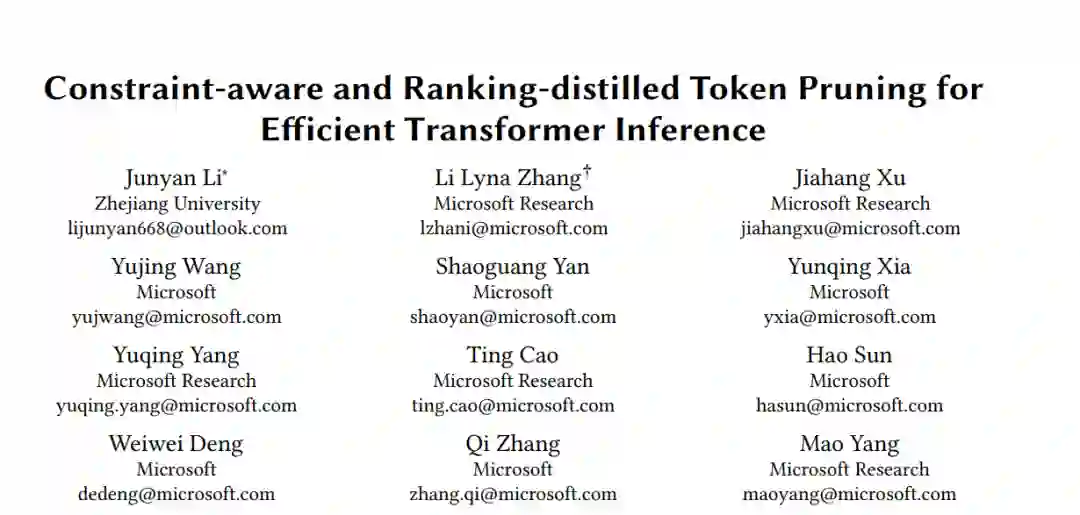 在资源受限的情况下,在下游任务上部署像BERT这样的预训练transformer模型是具有挑战性的,因为它们的推断成本很高,并且随着输入序列长度的增加而迅速增长。在这项工作中,我们提出了一个考虑约束的、排序蒸馏的令牌修剪方法ToP,该方法在输入序列通过各层时有选择性地移除不必要的令牌,使模型在保持准确性的同时提高在线推断速度。ToP通过一个排序蒸馏的令牌提取技术克服了传统自注意力机制中令牌重要性排序不准确的限制,该技术从未修剪的模型的最后一层提取有效的令牌排序,应用到被修剪模型的早期层。接着,ToP引入了一种粗到细的修剪方法,自动选择transformer层的最佳子集,并通过改进的𝐿0正则化在这些层内优化令牌修剪决策。在GLUE基准测试和SQuAD任务上的大量实验表明,ToP在准确性和速度上都超过了最先进的令牌修剪和模型压缩方法。ToP使BERT的平均FLOPs减少了8.1倍,同时在GLUE上达到了竞争性的准确率,并在Intel CPU上提供了高达7.4倍的实际延迟加速。