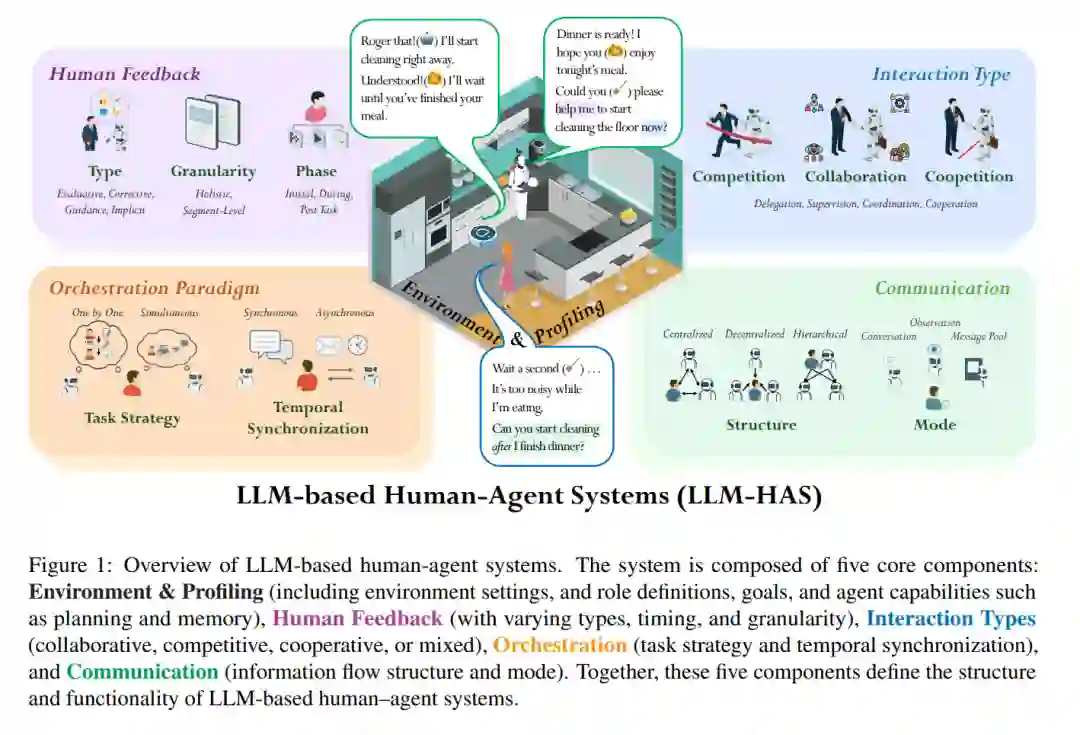 近年来,大型语言模型(LLMs)的飞跃式发展,引发了对构建完全自主智能体的广泛关注——这类系统以LLM为核心引擎,具备感知环境、做出决策并执行动作以达成目标的能力(Wang 等,2024a;Li 等,2024a)。这些智能体通常集成了记忆、规划和工具使用等模块,旨在在最小化人为干预的前提下,实现复杂任务流程的自动化(Xi 等,2025)。 然而,追求完全自治仍面临关键障碍:(1)可靠性问题依然突出。由于LLM存在“幻觉”倾向,即生成貌似合理但实则错误或无意义的内容,这种不确定性会削弱用户信任,特别是在多步操作链中可能造成严重后果(Gosmar 和 Dahl,2025;Xu 等,2024)。(2)任务复杂性成为瓶颈。自主智能体在处理需要深层专业知识、长链条执行、复杂推理、动态适应,或对上下文连贯性要求极高的任务(如科学研究)时,往往力不从心(Feng 等,2024;Yehudai 等,2025)。(3)安全性与伦理风险随自主程度上升而加剧。智能体可能执行意料之外的有害行为、放大训练数据中的社会偏见,或在关键决策场景中(如金融、医疗或安全)造成责任归属不清的问题(Mitchell 等,2025;Deng 等,2024;Shen 等,2024)。 这些挑战的持续存在表明,在许多现实世界场景中,完全自主并非理想解决方案(Mitchell 等,2025;Natarajan 等,2025),并凸显了一个常被忽视的核心观点:人类参与的不可替代性。人类在提供关键澄清、上下文信息与领域知识、反馈修正以及监管控制方面扮演着重要角色。这促使研究者开始转向一种新的系统设计范式:基于LLM的人机协作系统(LLM-HAS)。 尽管已有若干综述涵盖了基于LLM的自主智能体(Wang 等,2024a;Li 等,2024a)、多智能体系统(Tran 等,2025;Wu 等,2025)以及特定应用场景(Wang 等,2025b;Peng 等,2025),但尚无专门聚焦于LLM-HAS的系统性综述。本综述填补了这一空白,提供了对LLM-HAS的全面且结构化的概览,澄清了基本概念,系统梳理了核心组成模块、新兴应用场景,以及该领域特有的挑战与机遇。据我们所知,这仍是首篇专注于基于LLM的人机系统的综述文章。我们希望通过整合当前知识,推动该快速发展的跨学科领域的深入研究与技术创新。 为了支持本文的持续资源更新,我们维护了一个开源GitHub仓库,以补充本综述中的内容。我们期望本综述能够激发更多关于LLM-HAS的探索、创新及其在各类研究领域中的广泛应用。 本综述的组织结构如下:第二节定义并形式化LLM-HAS;第三节详述构成该系统的核心模块(如人类反馈、交互方式、编排与通信协议);第四节探讨多样化的应用领域;第五节介绍开源实现框架、数据集与评测基准;第六节则讨论LLM-HAS所面临的关键挑战与未来发展机遇。