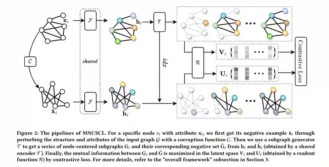 图互信息(GMI)[23]不使用损坏函数,而是最大化节点隐藏表示与其原始局部结构之间的MI。另一方面,图信息簇(GIC)[19]在DGI的基础上最大化节点表示与其对应的簇表示之间的MI。虽然这些方法取得了许多进展,但它们都专注于节点嵌入与仅一个相关图结构之间的MI,如图1所示。在现实中,我们可以从多个角度看待一个特定的事情。对于图数据,我们可以从多个角度观察图中的单个节点,但很少有文献关注这一点。直观地讲,对于社交网络中的个人来说,可能有一个基于血缘关系的亲戚社交圈,一个基于工作关系的同事社交圈,以及其他具有许多不同兴趣的朋友社交圈。如果我们从这些不同的社交圈中分析这个个人,实际上相当于从多个角度对该网络中的节点进行学习。基于此直觉,提出了多节点中心子图对比表示学习(MNCSCL).MNCSCL以网络中的每个节点为中心,在不同的语义下对其节点中心的区域子图进行采样,从而形成对应节点的几个不同视角,如图1所示.具体而言,首先通过corrupt函数生成一个负例,然后通过视图生成器生成原始图的一系列节点中心子图,并在负例上对对应子图进行采样.然后,将这些子图输入到图神经网络编码器中,在池化后获得中心节点及其子图的表示.最后,通过对比学习目标函数在潜空间中最大化同一节点的不同子图之间的互信息.在各种数据集上的实验结果表明,该设计具有优异的性能.论文的主要贡献如下: