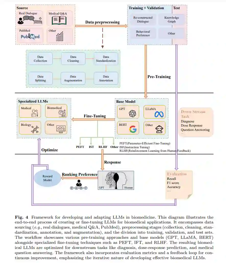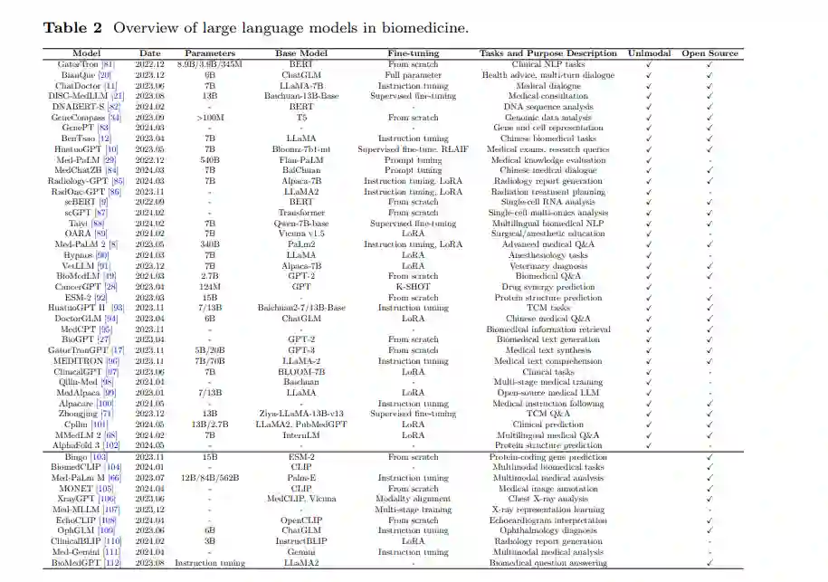 当通用大型语言模型(LLM)以零样本方式应用于生物医学领域时,往往会遇到各种挑战,主要原因在于该领域的高度专业化。生物医学领域使用独特的词汇、命名法和概念框架,通用LLM可能无法理解这些内容[113]。这种特异性不仅限于术语,还包括生物实体之间的复杂关系、复杂的疾病机制以及细微的临床背景。此外,生物医学领域涵盖了多样化的任务,从文献分析和临床笔记解读到支持诊断决策和药物发现过程。这种多样性要求LLM能够执行广泛的专业功能,每项任务都需要领域特定的知识和推理能力[114, 115]。此外,生物医学研究越来越依赖多模态数据的整合,这些数据类型包括文本、图像(如放射学扫描、组织学切片)和分子序列(如DNA、蛋白质结构)[116, 117]。有效处理和综合这些不同来源的信息对LLM提出了额外的挑战。为了应对这些挑战并提高通用LLM在生物医学应用中的适用性,已经开发了几种适应策略。这些策略包括领域特定的微调、架构修改以及从头开始创建专门的生物医学LLM。图4展示了适应或创建LLM用于生物医学应用的过程,概述了从数据预处理和整理到模型训练、微调和评估的关键阶段。适应过程涉及整理高质量的、领域特定的数据集,以捕捉生物医学语言和知识的细微差别。然后,使用这些数据集对现有LLM进行微调或训练新模型,结合在生物医学语料库上继续预训练、任务特定微调和多任务学习等技术,以提高在各种生物医学任务中的表现[12, 88]。通过这些努力,出现了多种专门针对生物医学研究和临床实践的LLM模型。表2提供了这些微调和定制模型的概述,展示了它们在生物医学领域内的多样性和专业性。