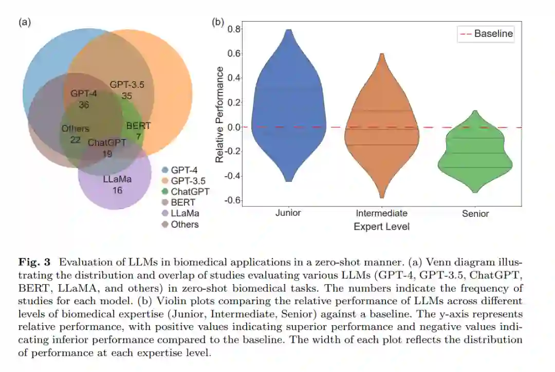我们的分析表明,未经专门训练的LLM在没有太多上下文提示的情况下,可以展示对生物医学术语和概念的基本理解。然而,它们在不同生物医学学科和任务中的表现有所不同。图3b提供了LLM在不同生物医学专业水平中的相对表现的宝贵见解。小提琴图表明,虽然LLM在所有专业水平上总体表现高于基线,但其表现最为一致的是中级水平。在高级和专家级水平上,表现的波动性更大,表明LLM在处理需要高级专业知识的复杂任务时可能会遇到困难[59]。不同生物医学学科的评估结果突显了LLM在零样本生物医学应用中的潜力和局限性[45, 77, 78]。在某些特定的生物医学领域,LLM的表现可与经验丰富的医生相媲美。然而,在需要深入生物医学知识和临床推理的更专业的上下文或复杂任务中,LLM可能表现出不足或完全失效。在大多数生物医学应用场景中,LLM的零样本表现尚不足以满足直接临床应用的要求,尤其是在罕见病诊断或复杂外科规划等极具挑战性的任务中[79, 80]。这些发现强调了在将LLM直接应用于复杂的生物医学任务时需要谨慎,除非进行微调或重新训练。尽管LLM在生物医学领域的前景令人期待,但在生物医学应用中的局限性必须得到考虑,并谨慎定义其在伦理和临床决策过程中的角色。