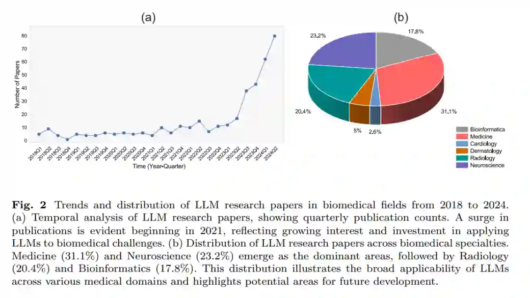 通用大型语言模型(LLM),如PaLM [1]、LLaMA [2, 3]以及GPT系列[4, 5],展示了其在广泛任务中的多功能性。这些模型在复杂的语言理解和生成任务中表现出色,包括翻译、摘要和细致的问题回答[6]。LLM能力的进步主要得益于深度学习算法的演进,特别是Transformer架构的引入及其后续优化[7]。随着LLM的不断成熟,其在各个领域的潜在应用日益显现,生物医学领域成为一个特别有前途的影响领域。图1展示了从2019年到2024年LLM及其变体在生物医学应用中的时间线,这一时间线说明了单模态和多模态LLM的快速发展。 生物医学LLM的显著成就展示了其广泛和深远的影响。例如,MedPaLM [8]在提供详细的医学答案和达成科学共识方面与临床专家达到了92.9%的一致性。在基因组学领域,scBERT [9]通过改进的Performer架构为每个基因生成嵌入,增强了单细胞基因组数据的分析。像HuatuoGPT [10]、ChatDoctor [11]和BenTsao [12]这样的领域特定LLM的开发展示了其在可靠医学对话中的能力,显示了LLM在临床交流和决策支持中的潜力。从主要以单模态LLM为主的进展到越来越多的多模态LLM方法,反映了LLM在解决复杂生物医学挑战中的日益适应性。这种转变使得不同数据类型(如文本、图像和结构化临床数据)的整合成为可能。 大型语言模型(LLM)在生物医学领域研究的快速增长和多样化进一步通过图2中的趋势得到了证实。对2018年至2024年生物医学领域LLM研究论文的时间分析表明,相关文献的数量逐年增加,并在2021年开始激增(图2a)。这一趋势表明人们对将LLM应用于生物医学挑战的兴趣和投入正在不断增加,反映了技术进步以及LLM在满足医疗保健和科研需求方面潜力的认可。这些研究论文在不同生物医学领域的分布显示,“医学”和“神经科学”是主要的研究重点领域(图2b)。这一分布表明LLM在不同医学专业和研究领域的广泛适用性,同时也指出了未来扩展和发展的潜在领域。